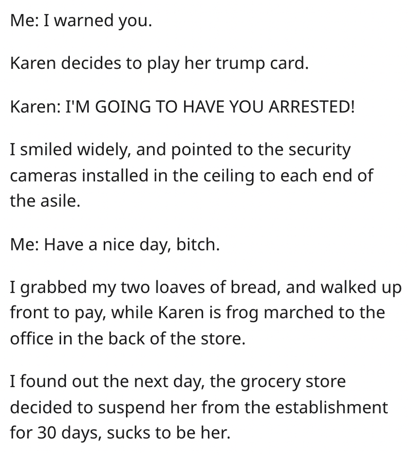 Consequently, he leaves with his two loaves of bread, while Karen faces suspension from the store.