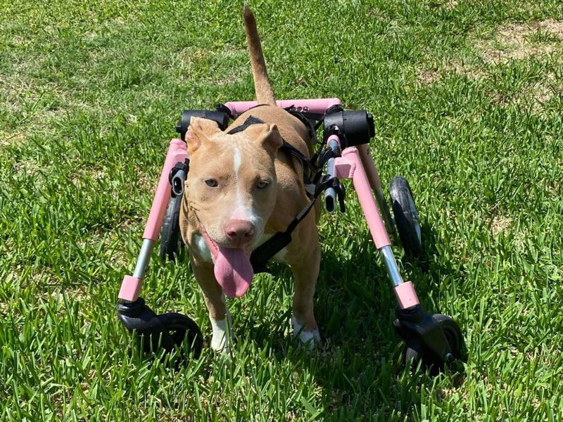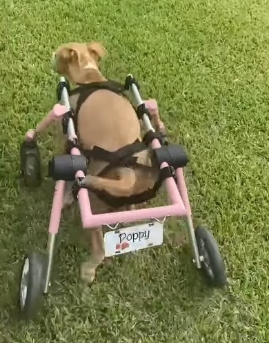 Pobby’s life didn’t change overnight. Poppy took cheerfully in her wheelchair for three months to get to where she is now.