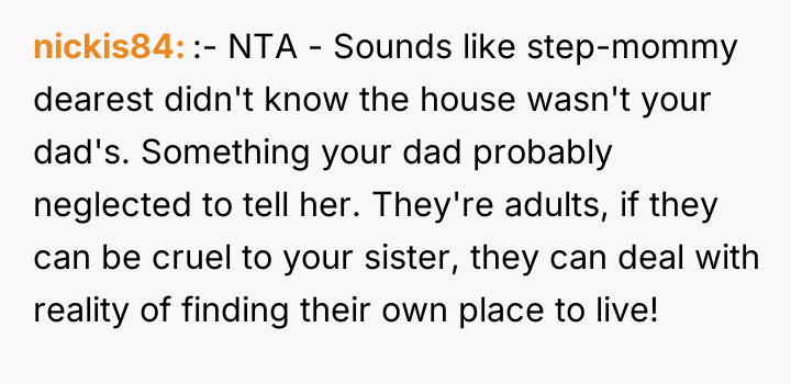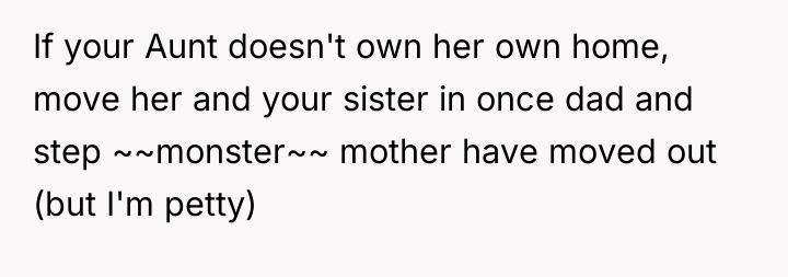 AITA for kicking out my dad and his pregnant wife out of the home I legally own after they sent my depressed sister to live with our aunt?