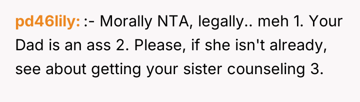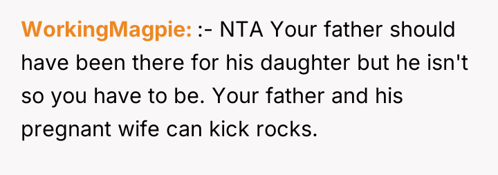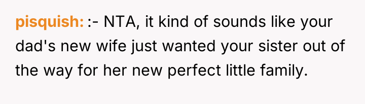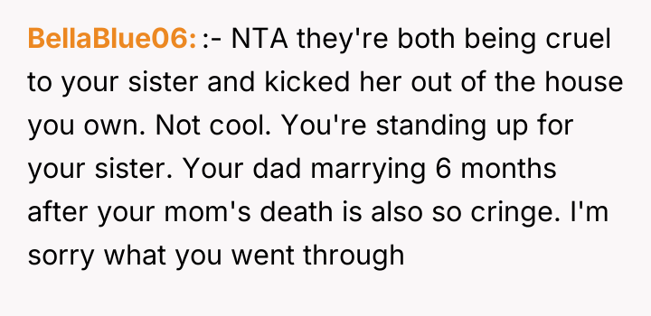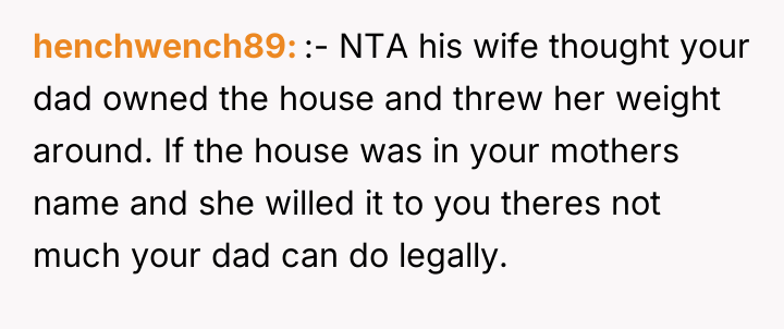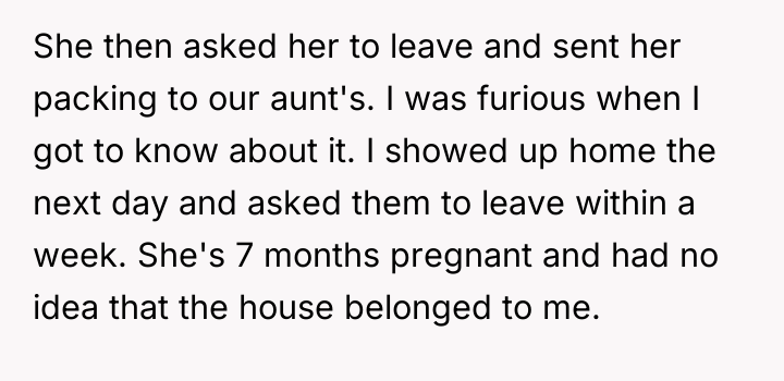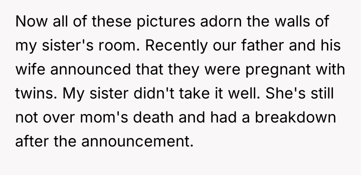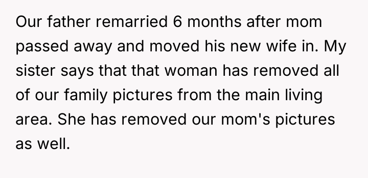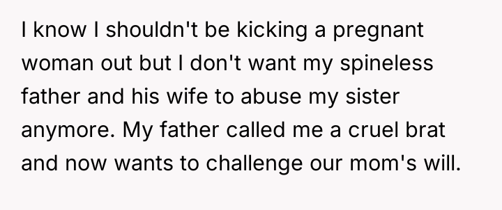 As family therapist and author Dr. Harriet Lerner famously stated, "The greatest loss of all is the loss of ourselves in relationships." This situation highlights a severe breakdown in familial boundaries and respect following a major life transition, complicated by grief and a significant power imbalance. The OP's primary motivation appears to be protective, driven by anger over the alleged emotional abuse toward the sister, specifically the stepmother's cruel comments equating the sister to the deceased mother and forcing her out. The removal of family photographs further symbolizes a perceived erasure of the OP's history and the memory of their mother, escalating the conflict. The father’s remarriage and subsequent actions—allowing the stepmother to dictate terms and display hostility toward his existing children—suggest an abdication of parental responsibility and a failure to manage the transition between his two family units. The OP’s reaction, while emotionally charged, stems from a perceived need to assert control over the environment (the inherited home) that their mother intended for legacy preservation, leading to a drastic and legally complex confrontation. The OP's action of issuing a one-week eviction notice to a seven-month-pregnant stepmother is an extreme measure that, while potentially effective in removing the immediate source of conflict (the stepmother), opens the door to significant legal and emotional fallout, as evidenced by the father threatening to challenge the will. While the OP acted to defend their sister, a more constructive initial step might have involved formal communication regarding boundaries, mediation (if possible), or seeking legal counsel *before* issuing an ultimatum. Future handling of such complex inheritance and blended family dynamics requires clear legal documentation and measured, rather than reactive, boundary enforcement.