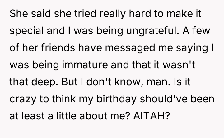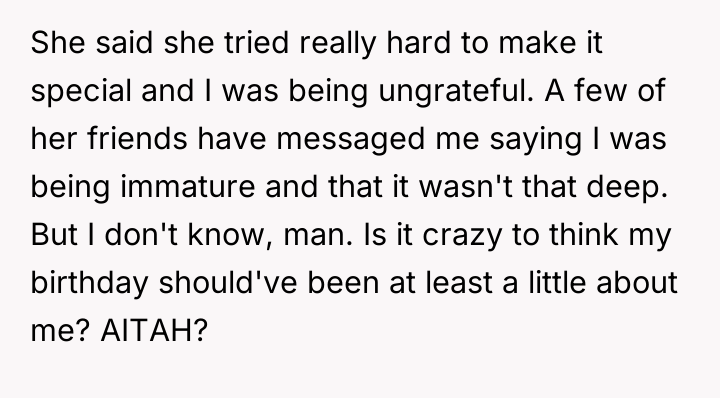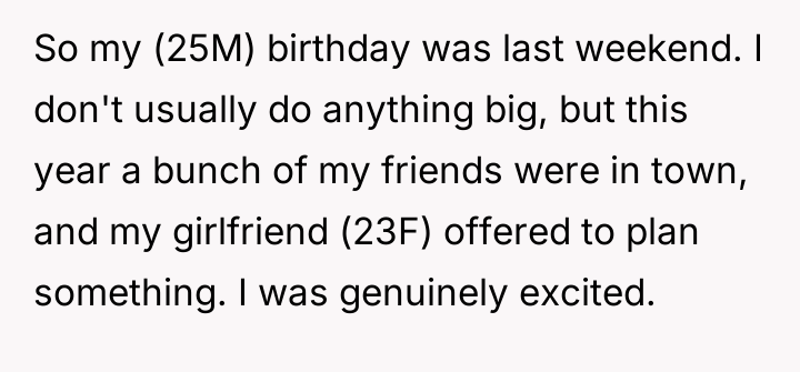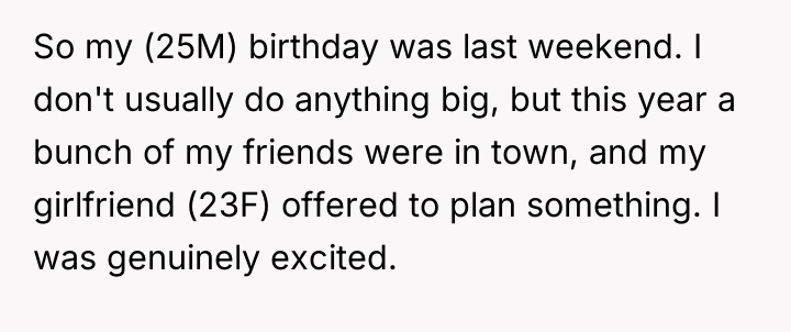 The user, a 25-year-old man (OP), celebrated his birthday last weekend. His 23-year-old girlfriend offered to plan a special event, which initially excited the OP, especially since several friends were visiting the area.