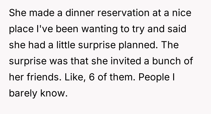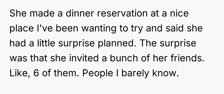 The surprise element of the plan turned out to be the inclusion of six of the girlfriend's friends, including someone the OP actively dislikes. During the dinner, the girlfriend focused almost entirely on her friends, resulting in no acknowledgment of the OP's birthday. Feeling ignored and overshadowed, the OP quietly left after paying for his meal, leading to accusations from his girlfriend and her friends that he was ungrateful and immature. The central dilemma for the OP is whether his expectation for his birthday to be about him was reasonable.