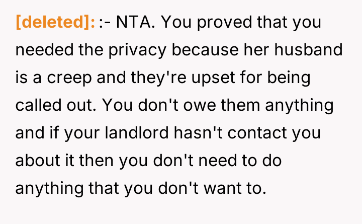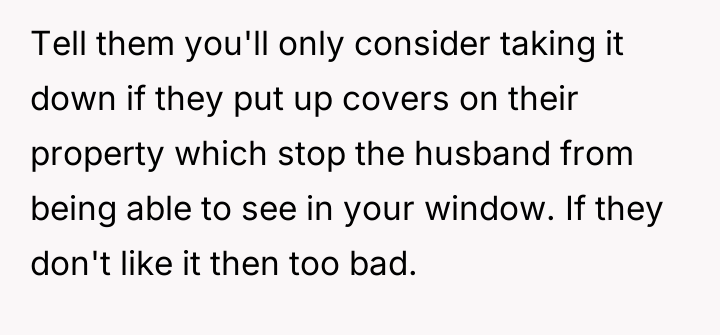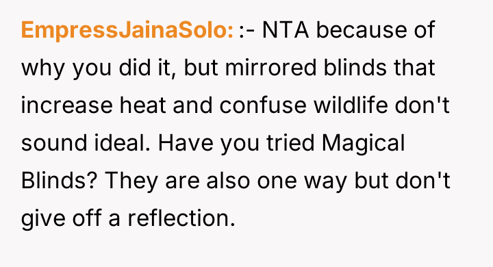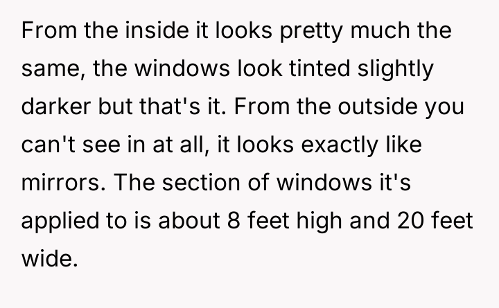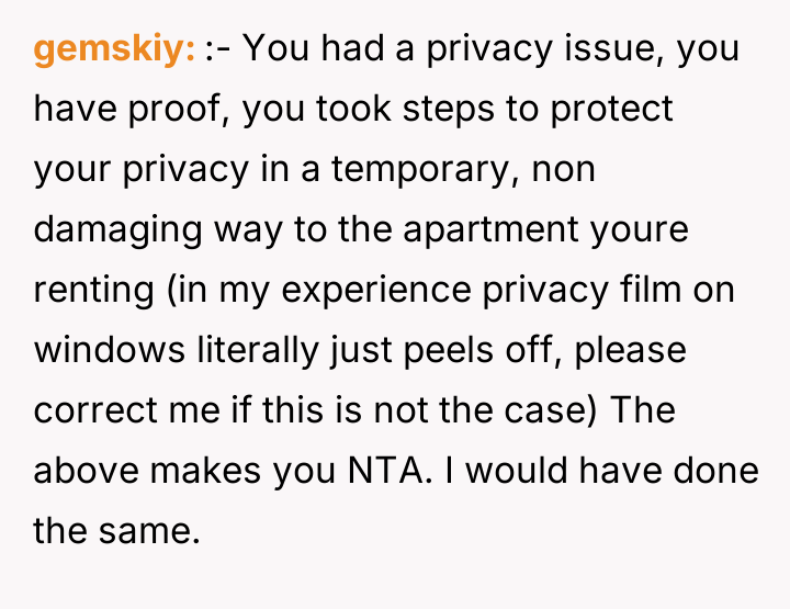 As renowned researcher Dr. Brené Brown explains, "."Boundaries are the distance at which I can love you and me simultaneously." The core issue here revolves around the establishment and enforcement of personal boundaries. The OP initially attempted a low-level boundary maintenance by closing the blinds, which was ineffective because it compromised their necessary access to sunlight for their living space and plants. The neighbor's behavior—staring into the apartment repeatedly—constitutes a clear violation of the OP's expectation of privacy in their own home, regardless of whether the neighbor intended malice or not. The OP's escalation to one-way mirrored film was a direct, physical response to an unaddressed social violation. While the neighbors cite aesthetic issues and reflected sunlight as negative impacts, these concerns are secondary to the OP's fundamental right to privacy. The husband's denial upon confrontation, immediately followed by the wife's complaints, suggests a dynamic where the neighbors feel entitled to an unimpeded view or are unwilling to take responsibility for their prior actions. The scale of the film (8x20 feet) is large, but it directly counters the scale of the privacy violation caused by the large bank of windows facing their yard. The OP’s action, while extreme in visual impact, was an appropriate self-defense mechanism for privacy when direct communication failed and the boundary violation persisted. For future situations, a more constructive approach might involve documenting the staring incidents, communicating the necessity of the privacy film clearly with objective evidence (if the landlord is unresponsive), and perhaps negotiating a smaller, less reflective solution if the neighbors offered a genuine compromise rather than complaints after the fact.