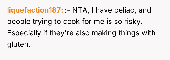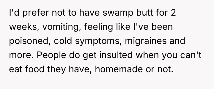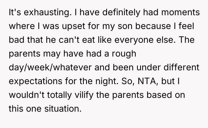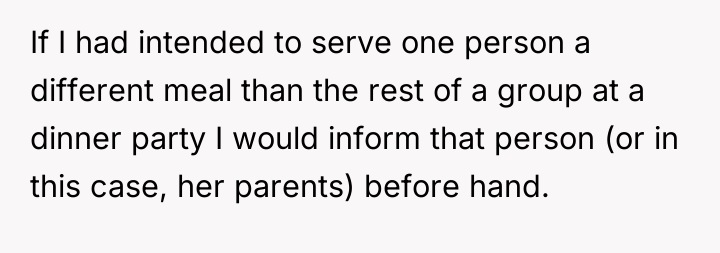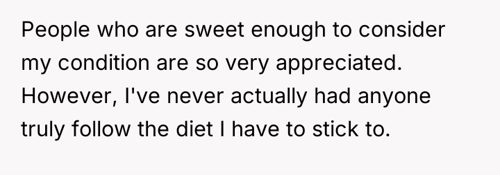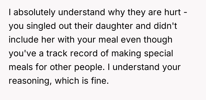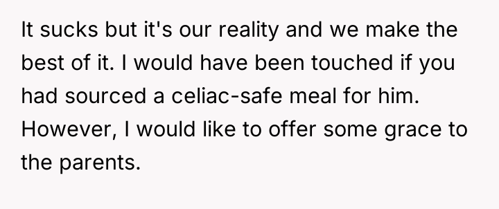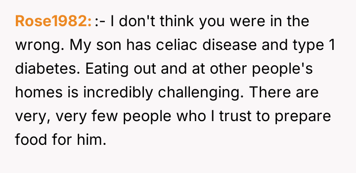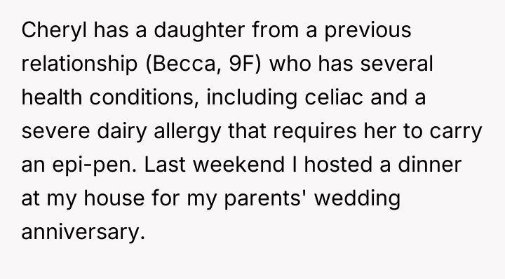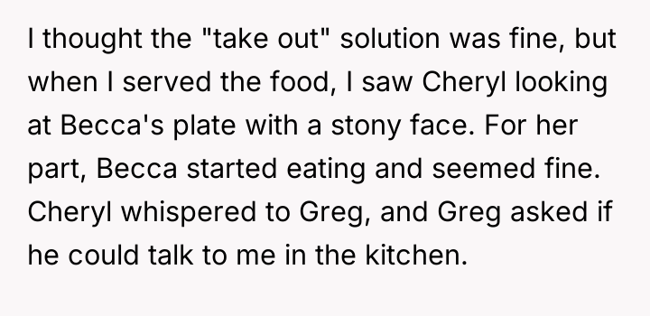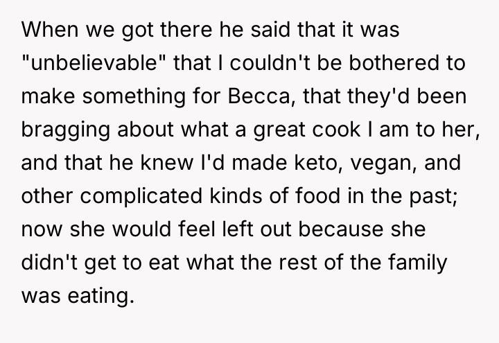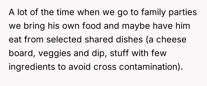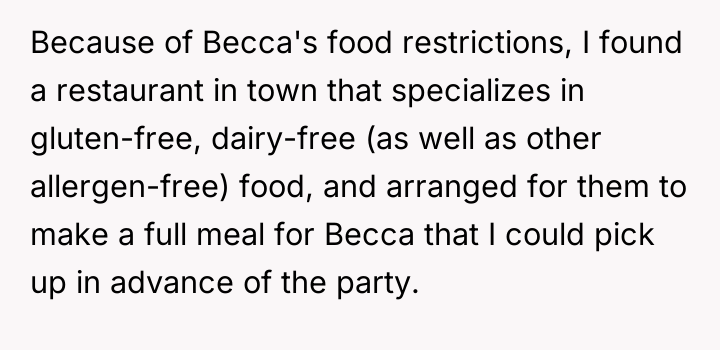 The original poster (OP) felt they took responsible action by sourcing a professionally prepared, allergy-safe meal for their niece, Becca, due to the seriousness of her health restrictions and OP's own attentional challenges. The central conflict arose when the brother, Greg, and his wife, Cheryl, interpreted this action not as diligence, but as a personal slight, suggesting OP failed to prioritize Becca's social inclusion over strict safety protocols.