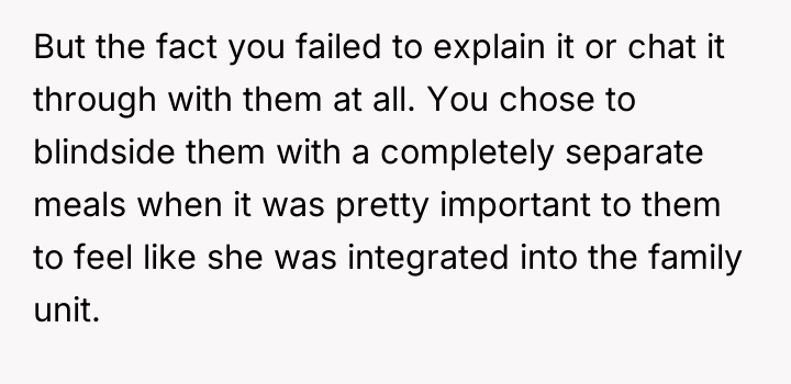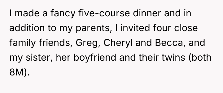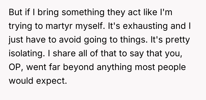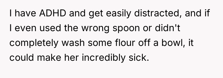 As renowned researcher Dr. Brené Brown explains, “Boundaries are the distance at which I can love you and me simultaneously.” This situation perfectly illustrates the tension between setting healthy personal boundaries (acknowledging the risks associated with OP's ADHD and the severity of Becca's allergies) and meeting family expectations regarding inclusion and emotional labor. The OP correctly identified a critical risk: attempting a highly specialized, life-critical meal while managing ADHD could lead to a severe health incident for Becca. Outsourcing was a responsible, safety-first approach. Greg and Cheryl’s reaction, however, appears rooted in misplaced focus; they prioritized the *symbolism* of a home-cooked meal (feeling included) over the *reality* of safety. Their response demonstrates a failure to validate the OP's limitations and the genuine threat posed by cross-contamination. Expecting the OP to manage extreme dietary requirements while hosting an event, especially given the known risks associated with their ADHD, shifts the emotional burden onto the host unfairly. The OP's action was appropriate given the stakes. A constructive recommendation for the future would involve proactive, transparent communication. Before the event, OP should have explicitly told Greg and Cheryl: 'Due to Becca’s severe allergies and my own distractibility with ADHD, I have arranged for a certified professional kitchen to prepare her meal to ensure 100% safety. I value her safety above all else.' This frames the decision as an act of care, not neglect, managing expectations before the disappointment can manifest.