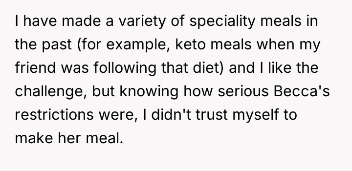 Did the OP’s choice to prioritize guaranteed safety by outsourcing Becca’s meal over attempting a potentially risky home-cooked meal fulfill their responsibility to their niece, or did this decision rightly cause hurt feelings by making Becca feel excluded from the family effort?