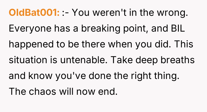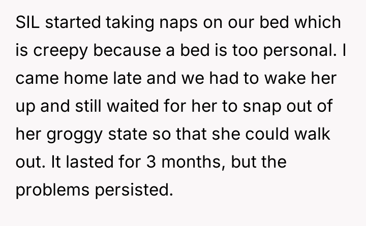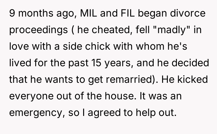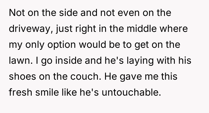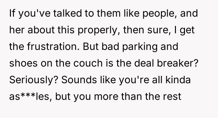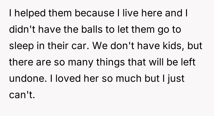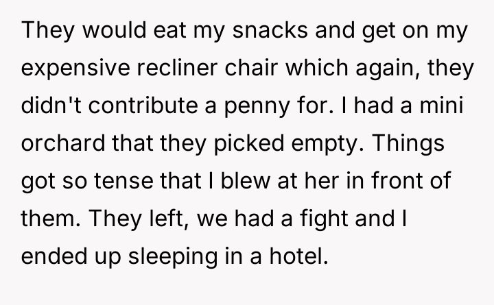 The situation reached a breaking point after OP accommodated four family members temporarily following the in-laws' separation, only to face continued disrespect, such as family members using private areas and damaging his belongings. The final incident involved the wife's brother blocking the driveway and resting on OP's couch with his shoes on, leading OP to pack his belongings and leave immediately without further discussion. OP is now left feeling angry and defeated, questioning if his abrupt departure was an overreaction or if he should have handled the separation differently.