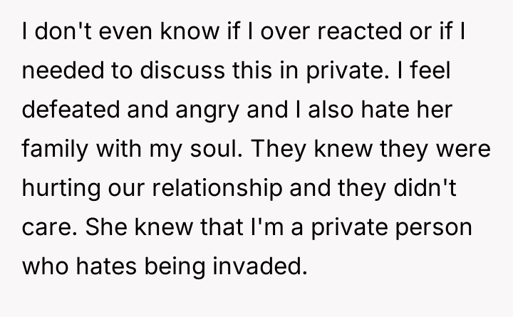The OP found himself at an emotional breaking point, unable to tolerate the ongoing invasion of his privacy and the lack of support from his wife, who seemed to view his needs as secondary to her family's demands. This conflict created an irreconcilable rift between the OP's strong need for personal boundaries and his wife's perceived enabling of her family's boundary violations.