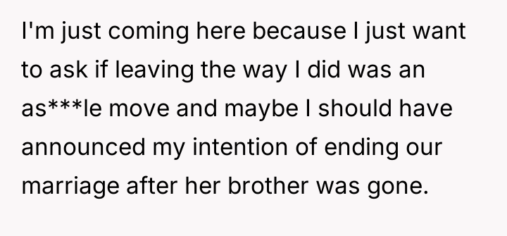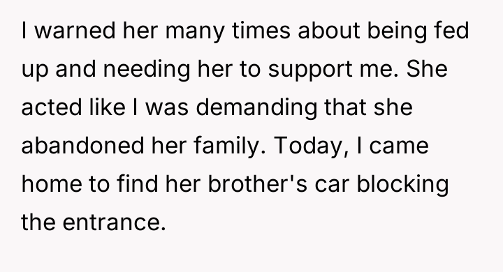 According to Dr. Casey Bennett, a specialist in conflict resolution and relational boundaries, "When core needs for personal space and respect are consistently ignored, especially after clear communication has failed, an individual's psychological safety within the relationship is severely compromised." The OP’s actions, while extreme in their suddenness, appear to be a self-protective response to chronic stress and a feeling of being unheard. For two years, the OP communicated his distress, yet the intrusion continued, culminating in a highly symbolic act of disrespect (the brother blocking the exit and lounging on the couch). This suggests that the OP reached a point of emotional exhaustion where further negotiation felt futile, leading to a decisive, albeit volatile, exit to enforce a boundary that his partner would not uphold for him. The wife's framing of the OP's boundary setting as 'demanding she abandon her family' indicates a fundamental misalignment in prioritizing relationship needs versus familial obligation. While leaving without a formal discussion might be viewed as harsh, it may have been the only way the OP felt he could regain control after feeling completely steamrolled. A potential path forward, should reconciliation ever be considered, would require intensive, impartial couples therapy focusing strictly on establishing and enforcing non-negotiable household rules, treating the family's presence as a third-party intruder.