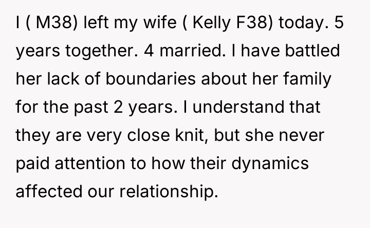 The man (OP, M38) made the decision to leave his wife (Kelly, F38) after five years together due to ongoing, unresolved conflict regarding her family's lack of boundaries within their shared home. The core issue stemmed from OP's wife failing to protect their space from continuous intrusions by her extended family, which included uninvited visits and the consumption of OP's personal property.