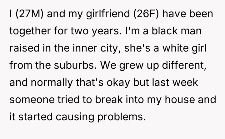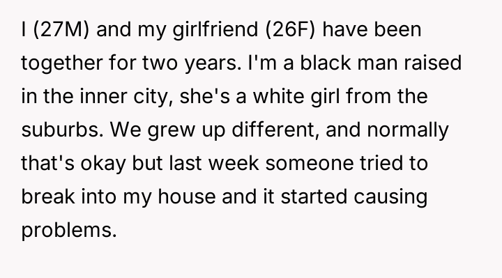 The user, a 27-year-old Black man from the inner city, and his 26-year-old white girlfriend from the suburbs have been in a two-year relationship facing differences in background. A recent incident involving a home invasion attempt brought this underlying tension to the surface. The core event occurred when three individuals tried to break into the user's house late at night while his recovering mother was home and physically unable to move.