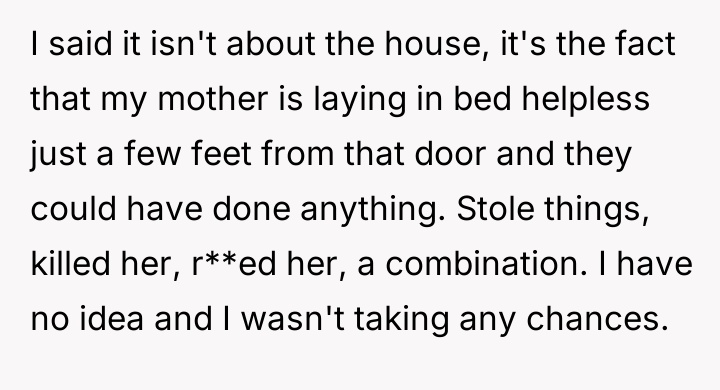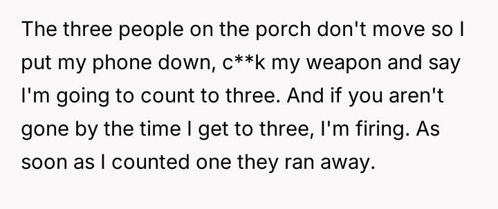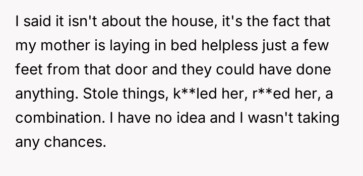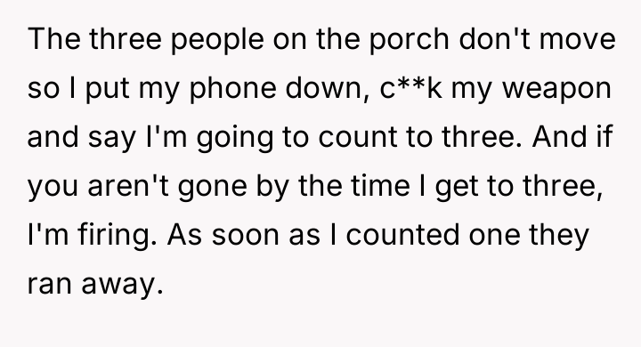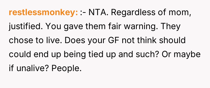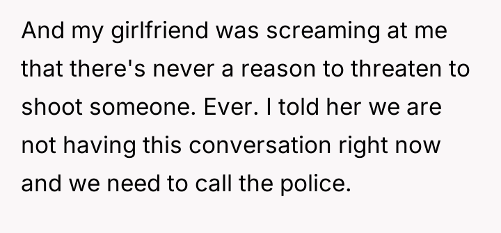 The user responded by arming himself and threatening lethal force against the intruders who were kicking his back door, successfully scaring them away. Immediately following the event, his girlfriend became extremely upset, arguing that threatening to shoot someone is never justified, regardless of the circumstances. The user is now facing a significant rift in his relationship because of his perceived willingness to use violence for self-defense, leaving him questioning if he was wrong to defend his vulnerable mother and home.