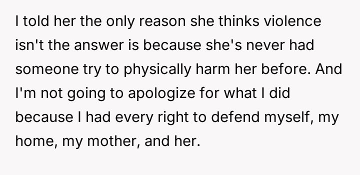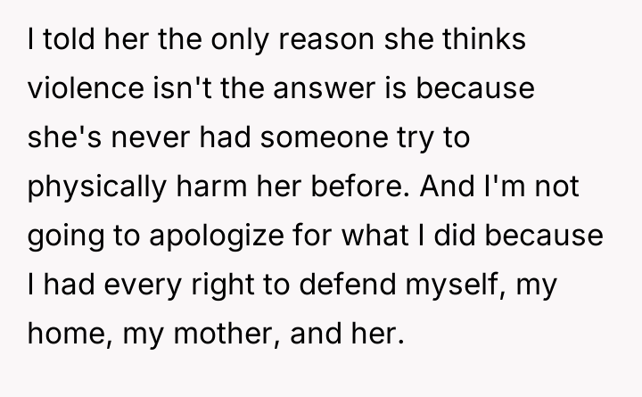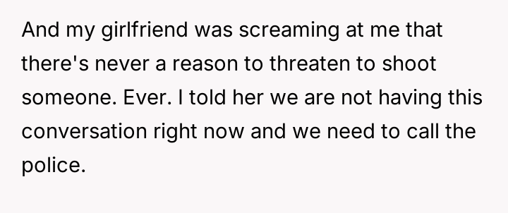 According to Dr. Quinn Ward, a specialist in situational ethics and threat assessment, 'Perceived threat level dictates the proportionality of the defensive response; when the threat involves the potential for grievous bodily harm against a vulnerable party, pre-emptive, deterrent action, including explicit threats of force, often moves from a questionable act to a necessary one.' The OP's primary motivation was the immediate vulnerability of his mother, who could not evacuate or defend herself. In situations involving home invasion, especially when an incapacitated person is present, the instinct for immediate, overwhelming deterrence is strong. The OP's action of announcing his armed presence and readiness to fire was a direct, defensive maneuver aimed at preventing escalation, not initiating violence. His girlfriend's reaction, while rooted in a desire for peaceful conflict resolution, appears to stem from a worldview where the abstract moral principle (do not threaten violence) overrides the immediate, concrete danger to life. The difference in their responses likely reflects their diverse backgrounds—the OP's environment informing a readiness for self-defense, versus the girlfriend's suburban experience potentially leading to an underestimation of the immediate danger. The path forward requires establishing a shared, realistic understanding of personal safety boundaries. The OP was justified in prioritizing his mother's immediate safety using deterrence, but moving forward requires open dialogue about future crisis management that respects both their needs for security and their ethical viewpoints.