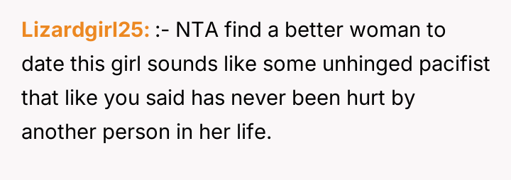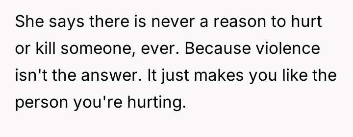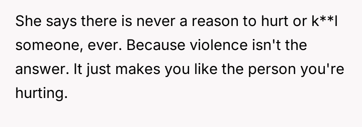The user is caught between his deeply held belief that protecting his defenseless mother from potential violence or harm requires the ability to use necessary force, and his girlfriend's absolute moral stance against threatening lethal violence under any circumstances. This conflict highlights a fundamental difference in how they perceive safety, threat assessment, and personal responsibility for defense, especially given their differing life experiences.
