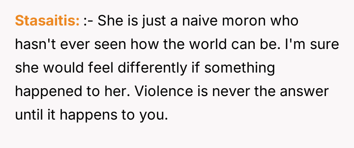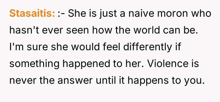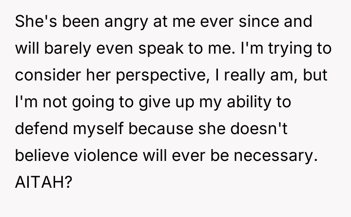 The central question remains whether the user was justified in using the threat of lethal force to protect his home and, crucially, his immobilized mother during a break-in attempt, or if his girlfriend is correct that such a threat crosses an absolute moral line. Readers must decide where the balance lies between the right to defense and the principle of non-violence.