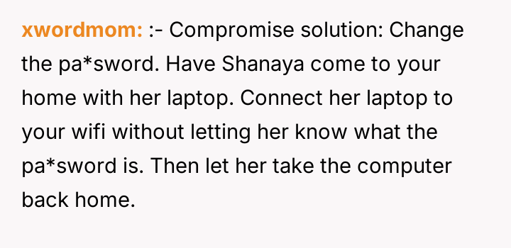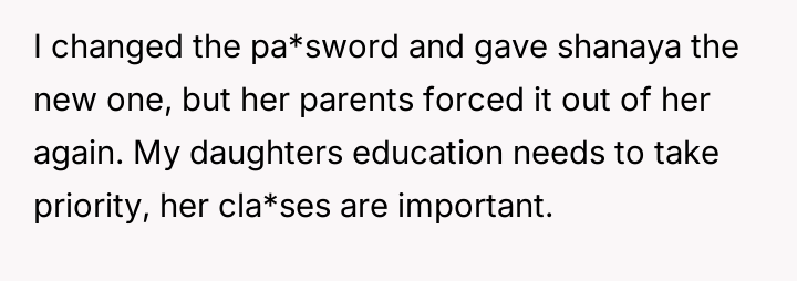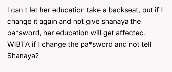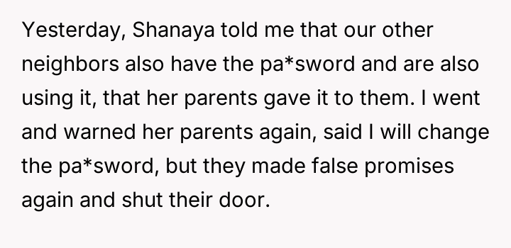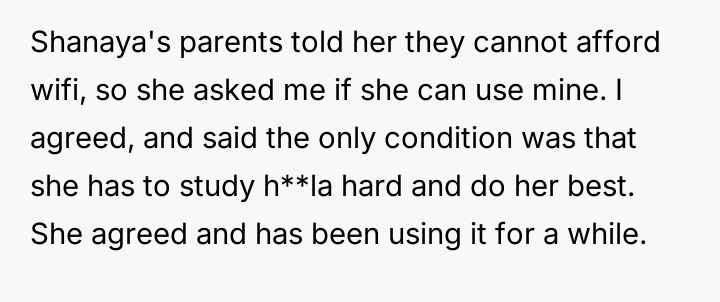 Should the OP maintain the agreement by sharing the new password with Shanaya, risking their daughter's connectivity, or should they prioritize their own child by withholding the password entirely? The core question remains: When sharing a limited resource under specific conditions, is it justifiable to revoke access completely when the recipient's family repeatedly violates those conditions?