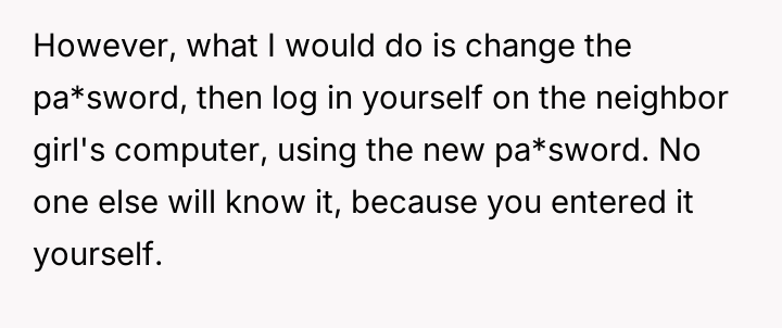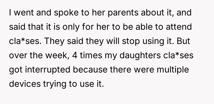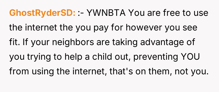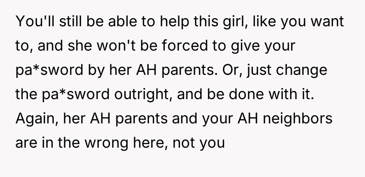 As renowned researcher Dr. Brené Brown explains, “Boundaries are the distance at which I can love you and me simultaneously.” In this scenario, the OP established a clear boundary: the Wi-Fi was for Shanaya's classes, limited to four devices total. The motivation behind the OP's initial action was generosity and community support, but the subsequent actions of the neighbors—sharing the password with their own parents and then another family—represent a significant boundary violation. The neighbors demonstrated a pattern of prioritizing their own convenience and potential savings over respecting the OP's established terms and their daughter's educational needs. This behavior shifts the dynamic from a supportive arrangement to one of exploitation. The OP's daughter, whose education is the primary concern, is suffering direct negative consequences due to the lack of reliability on the network. The OP's action of changing the password and then having it forcefully taken again is an escalation signaling that verbal communication has failed. Given the repeated violations, the OP's contemplation of not giving Shanaya the new password is an understandable reaction to protect their own dependent's well-being. A constructive recommendation would be for the OP to communicate firmly one last time, stating that due to multiple service interruptions, the arrangement is temporarily suspended until the parents can guarantee only Shanaya will use the connection. If trust cannot be re-established, they must prioritize their own household's needs without apology.