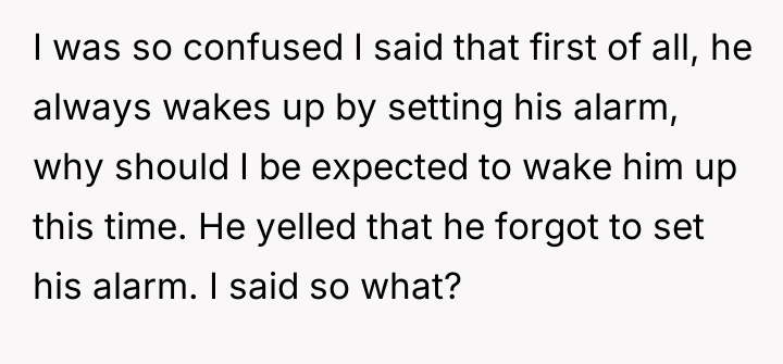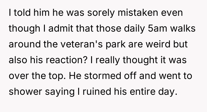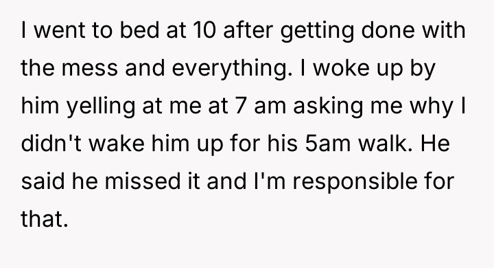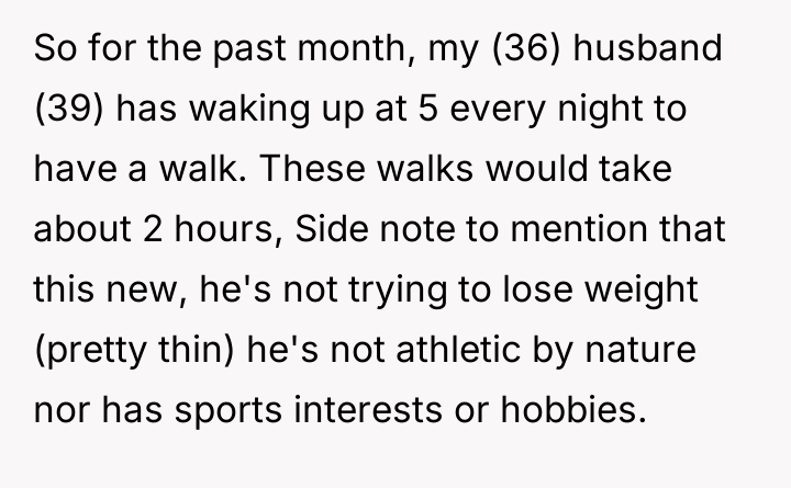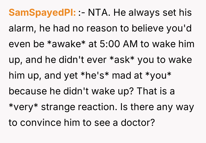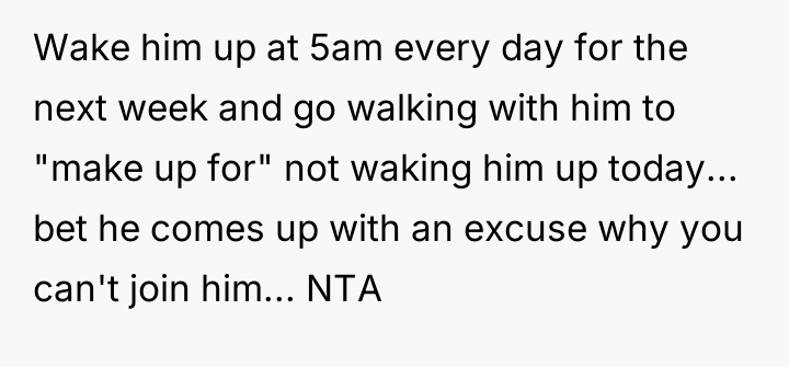 The original poster (OP) feels confused and distressed because her husband reacted with intense anger and silent treatment after she failed to wake him for his new, unscheduled 5 AM walk. The central conflict lies between the husband treating this new routine as a mandatory obligation for which the OP is responsible, and the OP viewing it as his personal habit that should be managed by his own alarm.