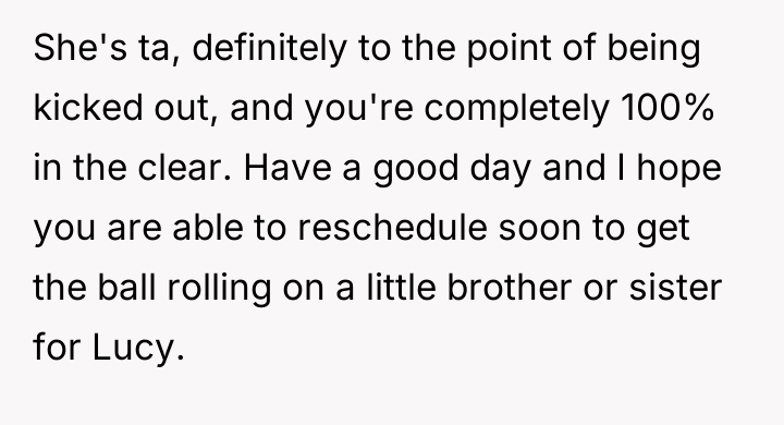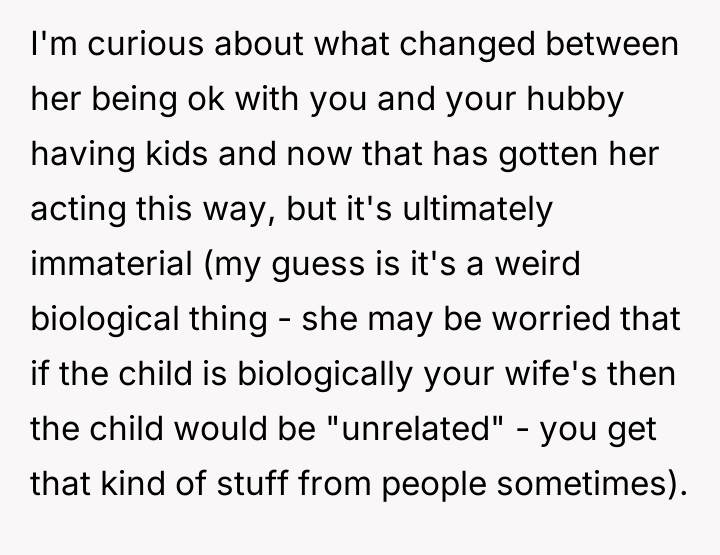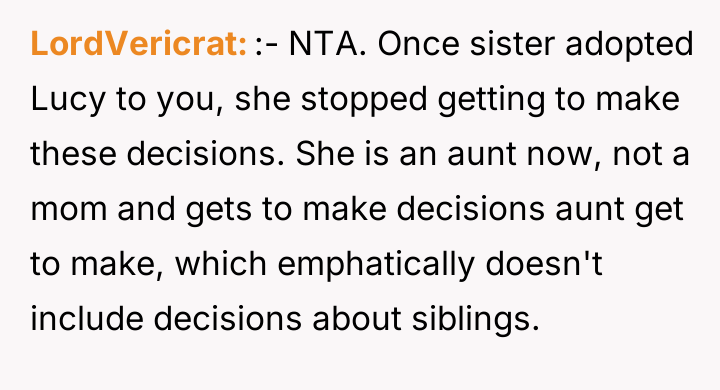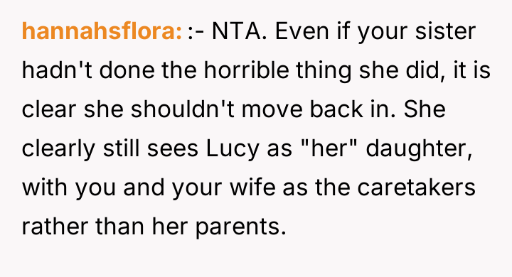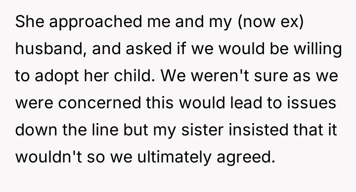 As renowned family therapist Dr. Terri Givens explains, “When adoption involves close family members, the lines of authority and emotional ownership often become dangerously blurred, creating fertile ground for boundary violations.” This situation is a clear illustration of boundary erosion within a kinship adoption framework. The OP and her ex-husband assumed guardianship of Lucy based on the sister's assurance that the relationship would remain supportive, yet the sister has maintained an inappropriate level of involvement. The sister's behavior—moving in, repeatedly questioning Lucy about siblings, and culminating in the physical sabotage of the fertility clinic appointment—demonstrates a failure to respect the OP's parental authority. The sister is conflating her biological tie and past sacrifice with present ownership over the OP's reproductive choices and the structure of Lucy’s future family. Her manipulative apology, coupled with involving the parents to pressure the OP, confirms a pattern of emotional blackmail aimed at maintaining control. The OP's action of having her sister leave was an appropriate, albeit severe, boundary enforcement. When communication breaks down and deliberate harm (sabotaging the consultation) occurs, immediate separation is often required. For future situations, the OP and her wife should establish rigid, non-negotiable boundaries regarding future children and any discussions about them. If the sister cannot respect these clearly defined parental boundaries, future contact regarding Lucy should be limited or mediated, and cohabitation should be avoided entirely.