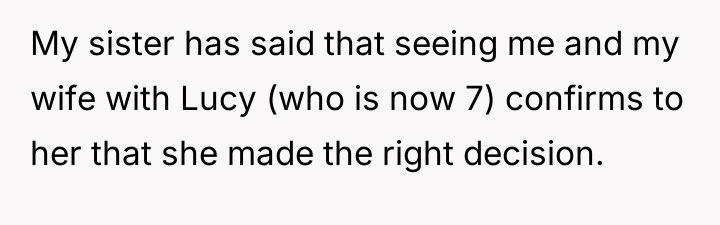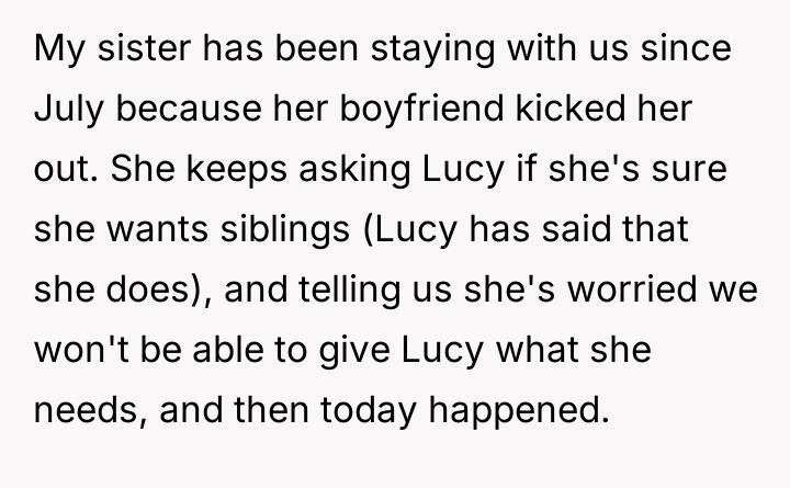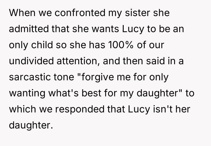 The Original Poster (OP) is facing a severe conflict stemming from a long-standing, complex family arrangement regarding the adoption of her niece, Lucy. The central issue now revolves around the OP and her wife's right to expand their family versus the biological mother's persistent, controlling desire for Lucy to remain an only child receiving exclusive attention, leading to destructive actions by the sister.