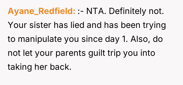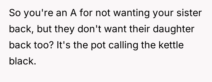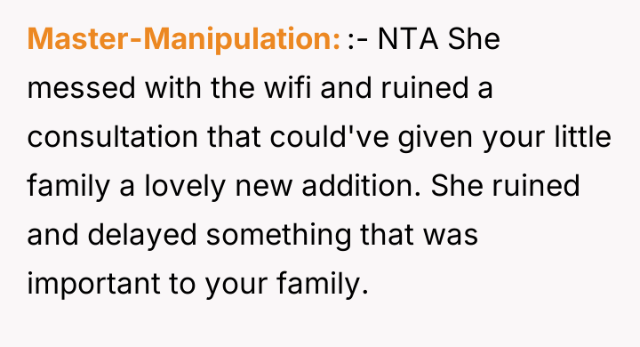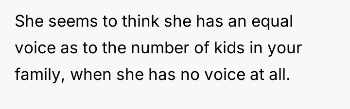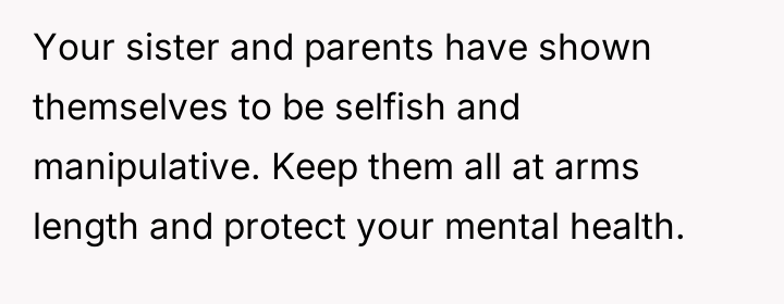 Given the sister's active sabotage of a medical consultation and the subsequent ultimatum posed to the OP—either prioritize the sister's desire for an only child or face further disruption—the core question remains: Should the OP tolerate the biological parent's continuing interference in her present family decisions, or was removing the sister entirely the necessary step to protect her established family unit?