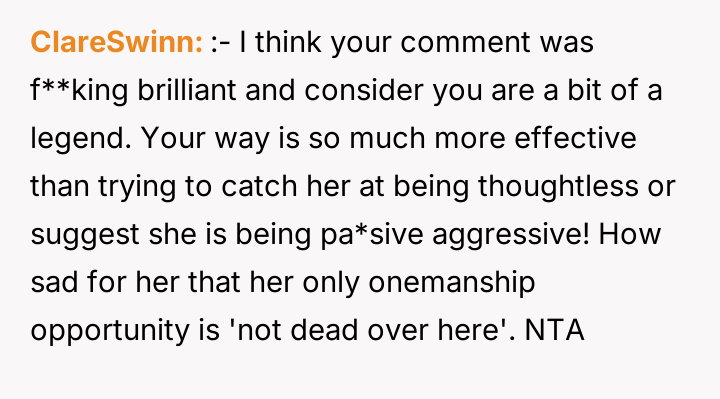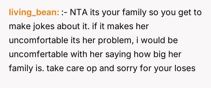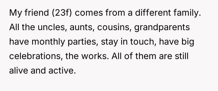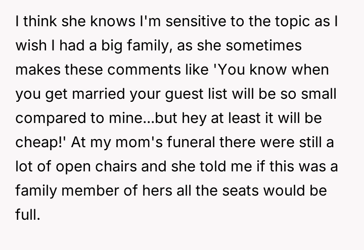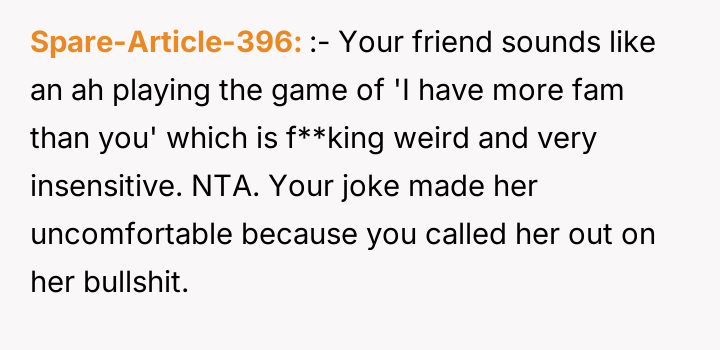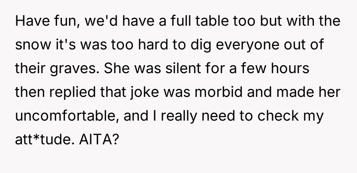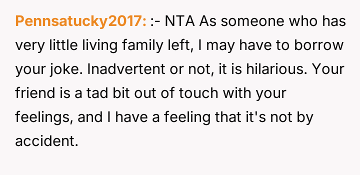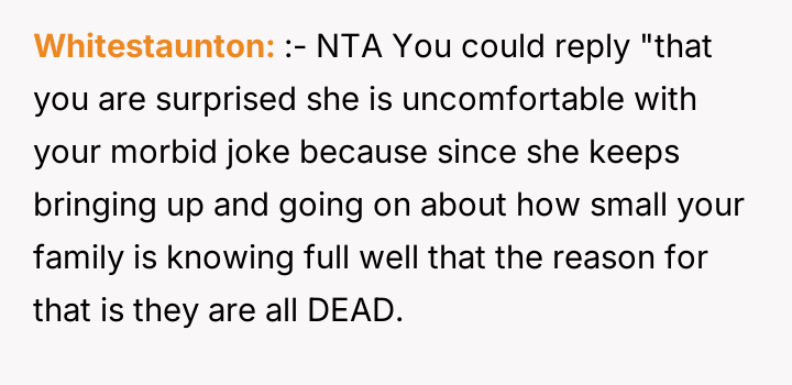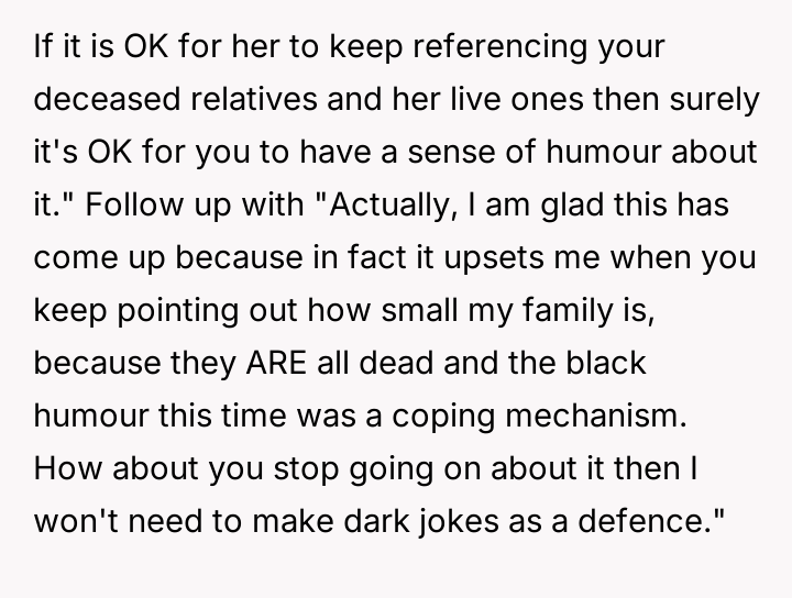 As renowned psychologist Dr. Harriet Lerner explains, “The healthiest way to deal with a difficult person is to change how you react to them.” In this situation, the dynamic is heavily colored by unresolved grief and a significant disparity in lived experience. The friend, operating from a place of abundance regarding family ties, seems unable or unwilling to recognize the profound emotional wounds her casual comparisons inflict on the OP, who is grieving continuous loss. The OP’s initial actions—posting about their smaller gathering—were likely an attempt to share joy within their existing support structure (siblings and BIL). The friend's subsequent private message, juxtaposing the OP's photos with her own large family, was a clear, albeit possibly unintentional, act of invalidation. The OP’s reaction—the morbid joke—was an extreme and destructive expression of pent-up anger and hurt, designed to shock the friend into recognizing the gravity of the OP's reality. While understandable as a reaction to repeated boundary violations, this communication strategy escalated the conflict significantly. While the friend was insensitive and repeatedly failed to practice empathy, the OP’s retort was inappropriate because it used the deceased family members as a weapon. A more constructive approach would have been direct, clear communication following the friend’s initial comments, such as, “Your comments about family size are painful for me because of my losses; I need you to stop making those comparisons.” Moving forward, the OP needs to either establish firm emotional boundaries with this friend or recognize that the friend's inability to handle sensitive topics might necessitate creating emotional distance.