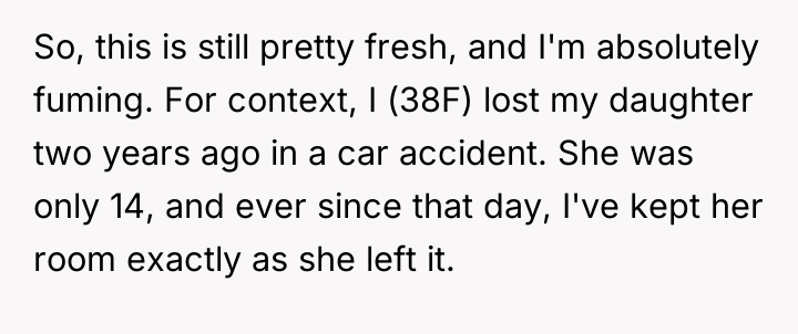 The poster, a 38-year-old woman (OP), is dealing with the profound grief of losing her 14-year-old daughter two years prior. As a way to cope, she has kept her daughter's room exactly as it was, viewing it as a necessary source of comfort and a preserved memory of her child.