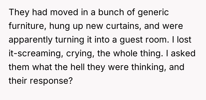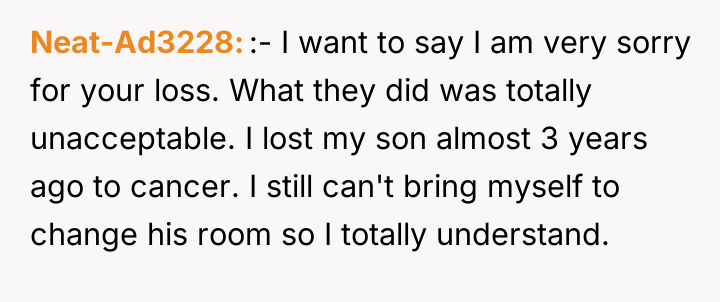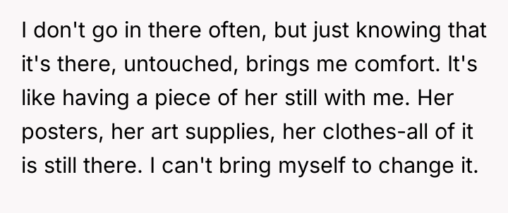 According to Dr. Taylor Barnes, a specialist in bereavement and loss, 'The physical space associated with a lost loved one often serves as an essential anchor for a grieving individual, and any unauthorized alteration of that space is experienced as a secondary, often traumatic, loss.' The OP's decision to keep the room untouched is a common and valid coping mechanism known as maintaining the connection, especially in the context of sudden or traumatic loss.