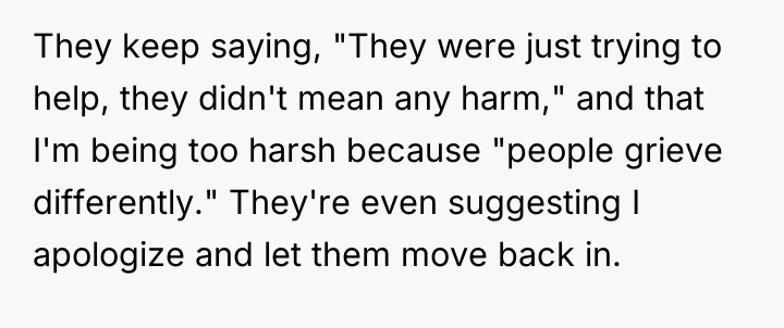 The situation forces a debate over the boundaries of grief expression within family dynamics. Should the OP prioritize her emotional need for the room's preservation, or should she have shown more tolerance for her houseguests' unsolicited intervention, even if well-intentioned? The question remains whether the OP was justified in her immediate eviction of the couple.