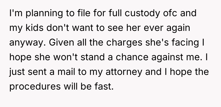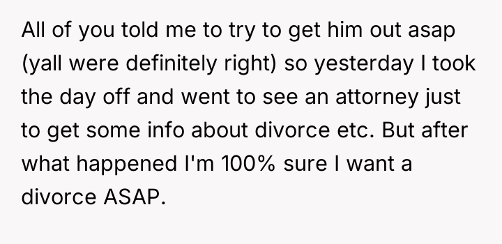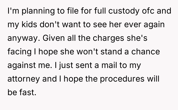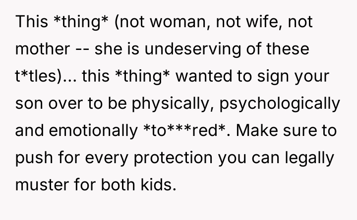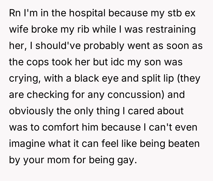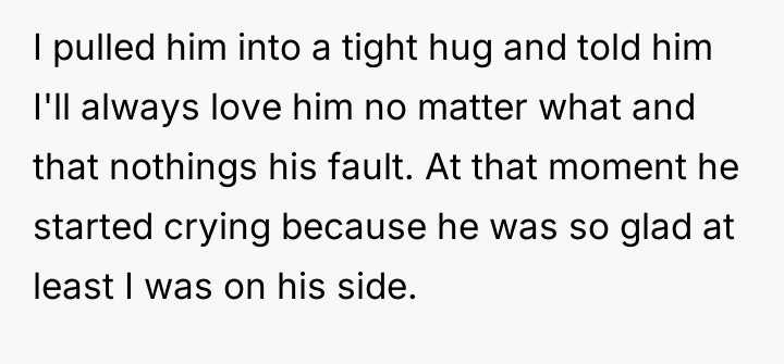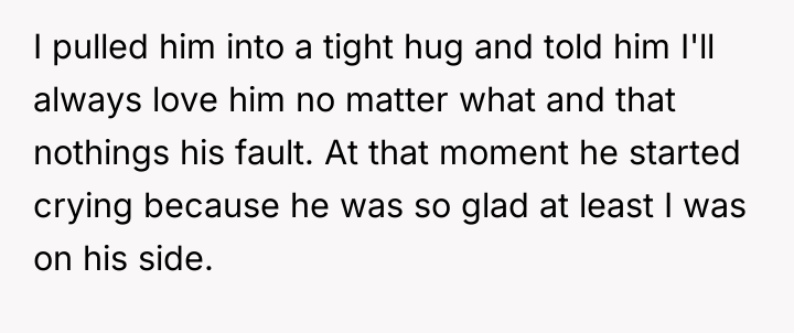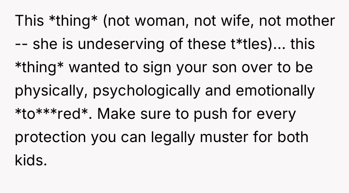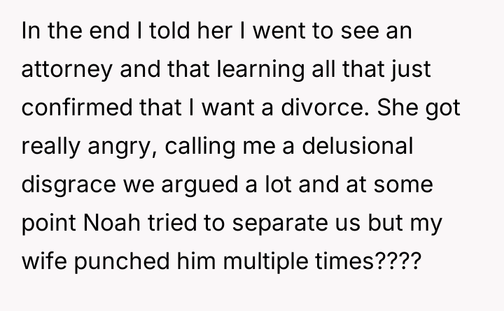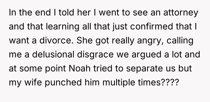 After consulting an attorney, the OP informed his son of the potential divorce and his commitment to protecting him, which brought the son great relief but also deep sadness. The OP then confronted his wife, who reacted with anger, using derogatory language and ultimately resorting to physical violence against both the OP and their son. Faced with this extreme behavior and physical assault, the OP is now seeking a divorce and full custody. His central dilemma is how to swiftly and securely separate his family from his wife's harmful actions.