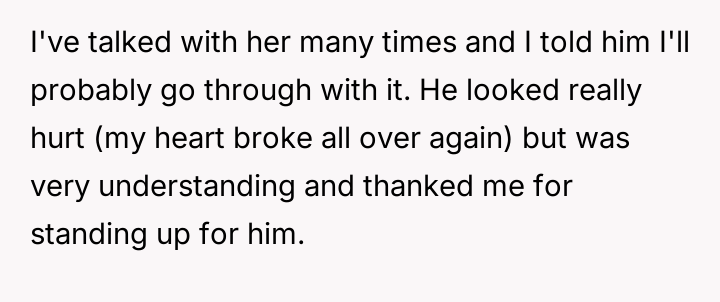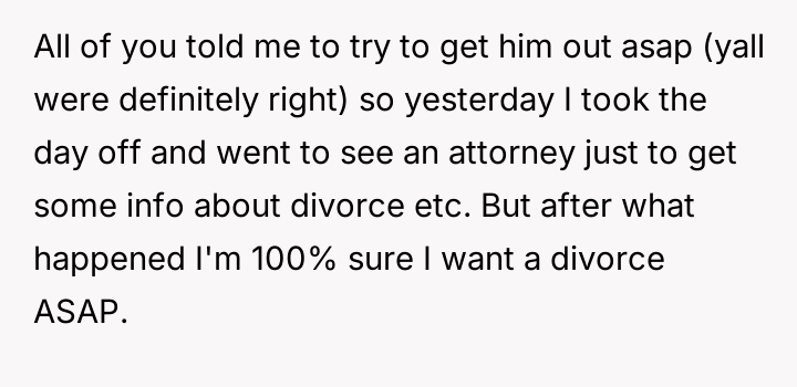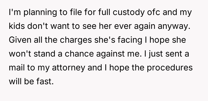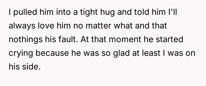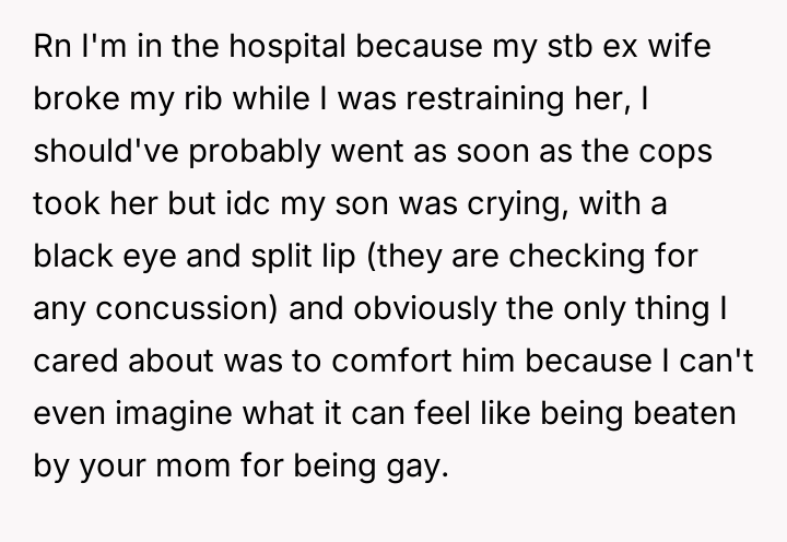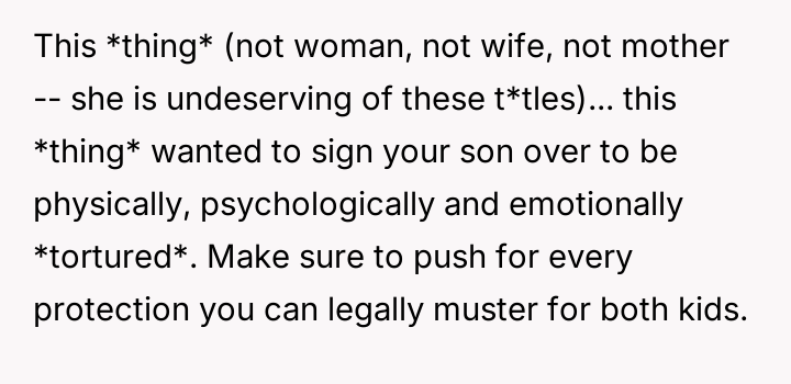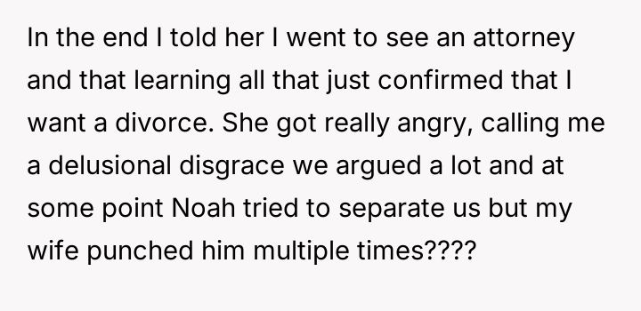 After consulting an attorney, the OP informed his son of the potential divorce and his commitment to protecting him, which brought the son great relief but also deep sadness. The OP then confronted his wife, who reacted with anger, using derogatory language and ultimately resorting to physical violence against both the OP and their son. Faced with this extreme behavior and physical as***lt, the OP is now seeking a divorce and full custody. His central dilemma is how to swiftly and securely separate his family from his wife's harmful actions.