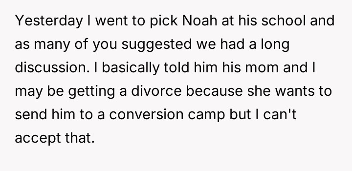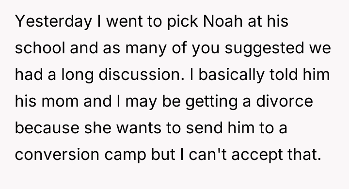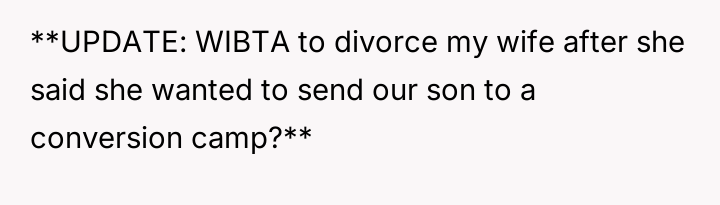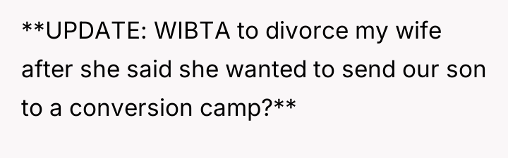 UPDATE: WIBTA to divorce my wife after she said she wanted to send our son to a conversion camp?