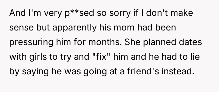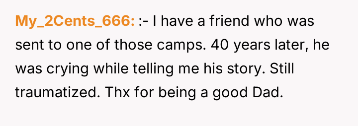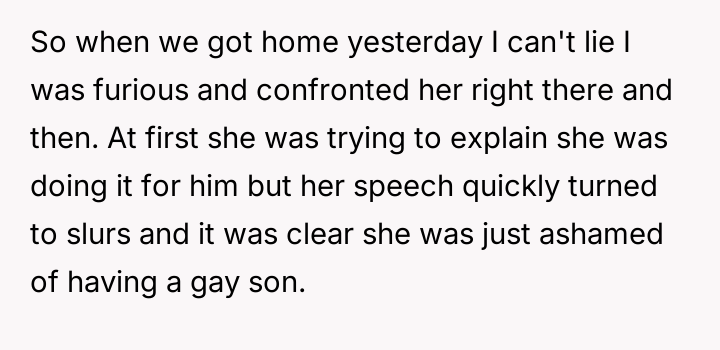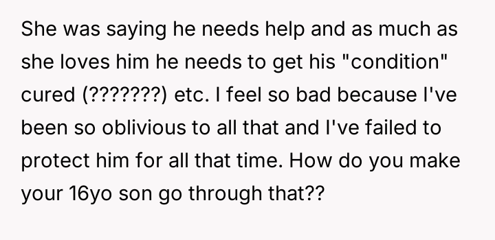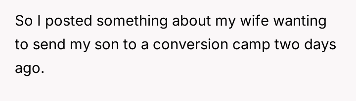 The Original Poster (OP) discovered that his wife intended to send their 16-year-old son, Noah, to a conversion camp because of his s*xual orientation. This disagreement over a serious decision regarding their son's well-being escalated into a major conflict between the OP and his wife. The OP had previously shown his wife materials detailing the harm caused by such camps, but she remained firm in her belief that their son needed to be "cured."