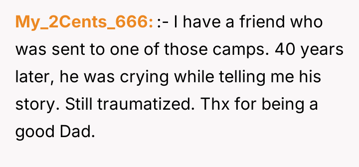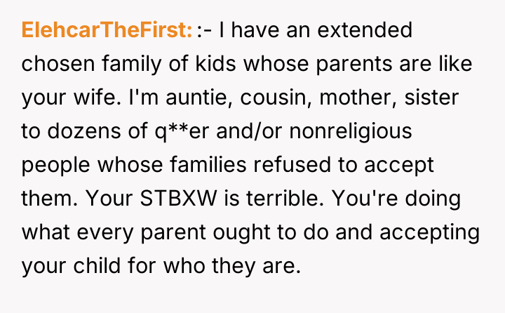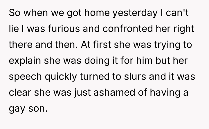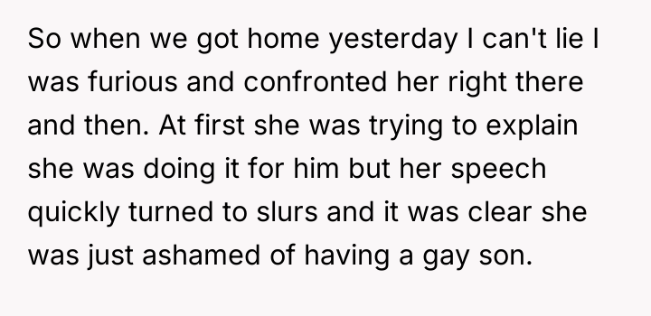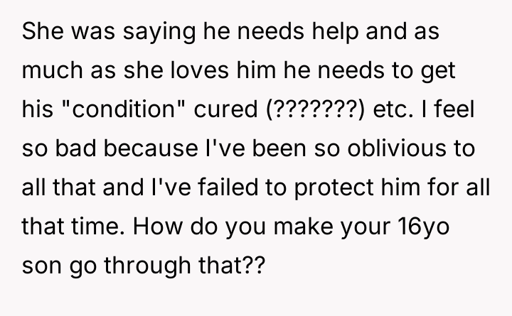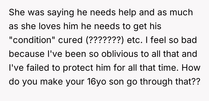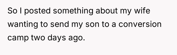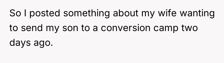 The Original Poster (OP) discovered that his wife intended to send their 16-year-old son, Noah, to a conversion camp because of his sexual orientation. This disagreement over a serious decision regarding their son's well-being escalated into a major conflict between the OP and his wife. The OP had previously shown his wife materials detailing the harm caused by such camps, but she remained firm in her belief that their son needed to be "cured."