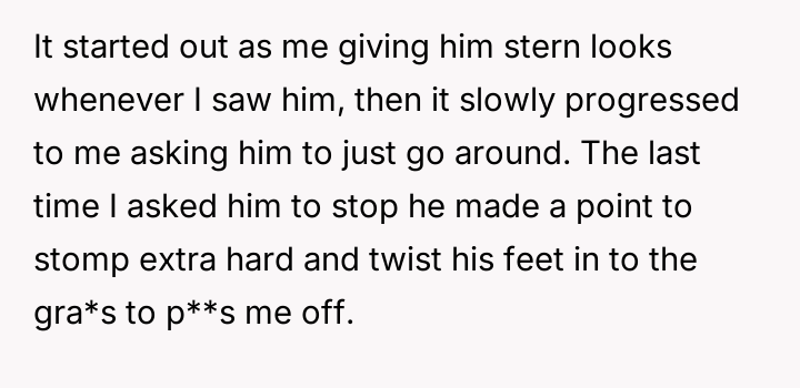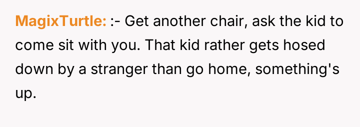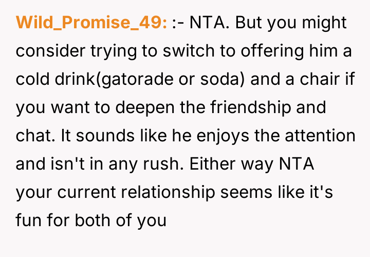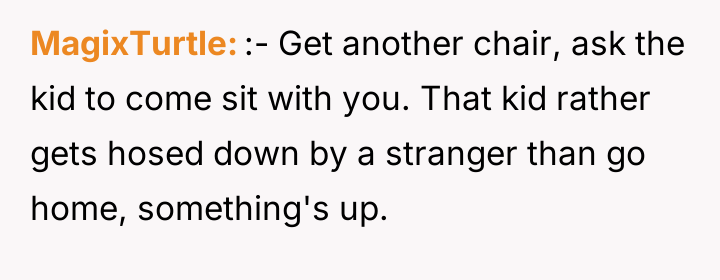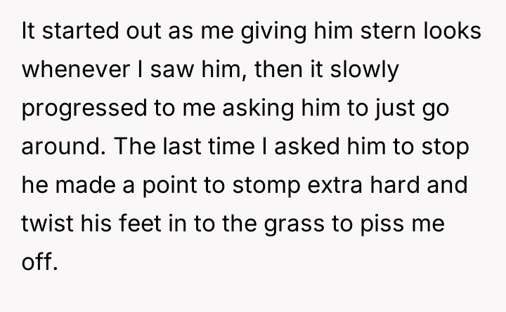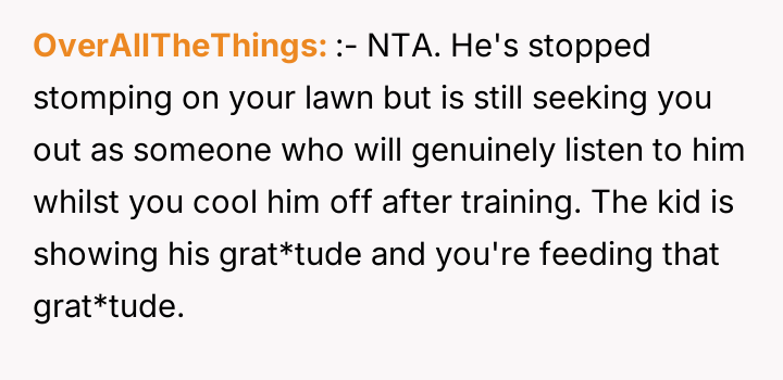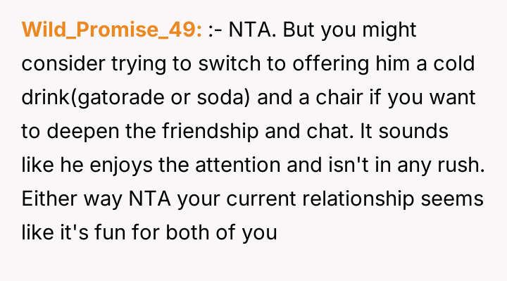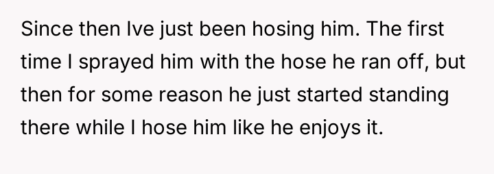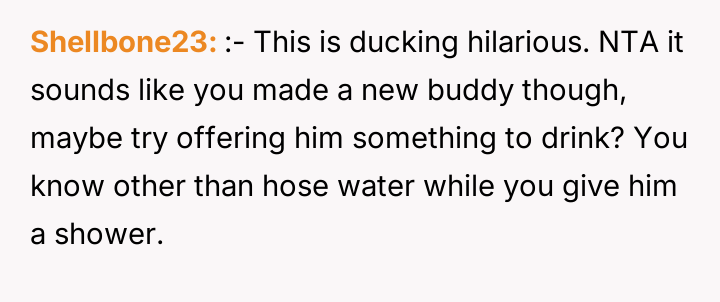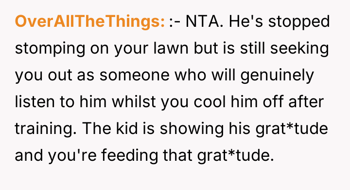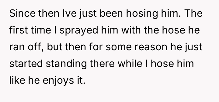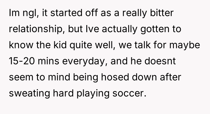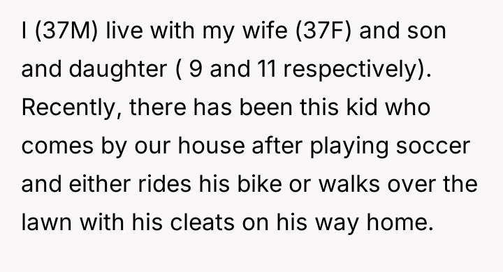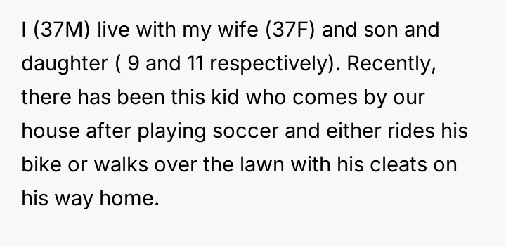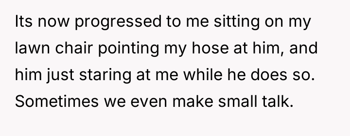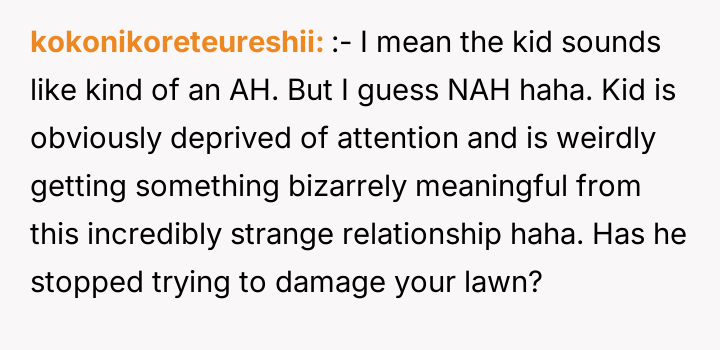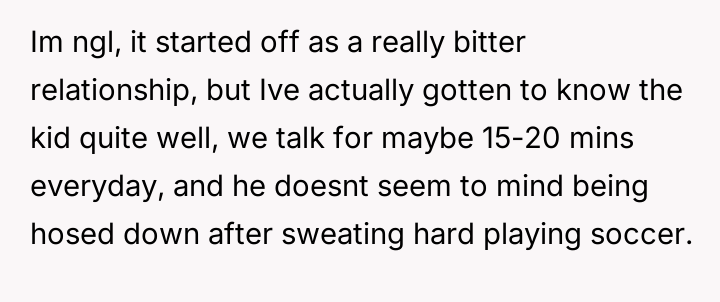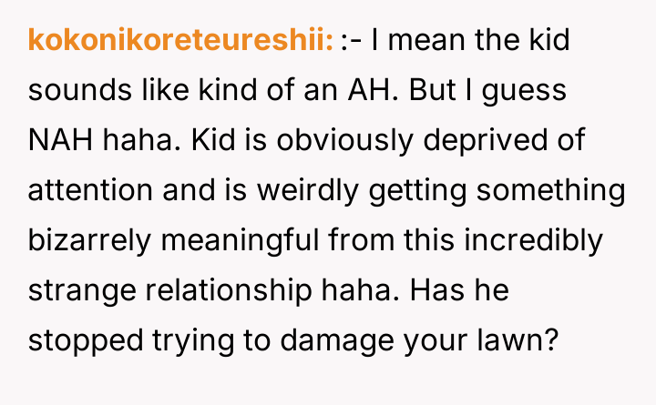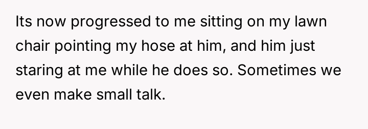 As renowned researcher Dr. Brené Brown explains, “Boundaries are the distance at which I can love you and me simultaneously.” In this scenario, the initial boundary—protecting the lawn from cleats—was clearly violated, leading the OP to escalate his enforcement method from verbal requests to direct, physical action (hosing). This escalation bypassed constructive communication and established an unusual power dynamic where the child initially reacted with defiance, only to seemingly adapt to the OP's unpredictable behavior. The situation has devolved into an example of maladaptive co-regulation. The OP derives entertainment from exerting control (the hose), and the child appears to derive attention or perhaps relief (from the heat after soccer) from standing there. While the OP perceives this as harmless fun, the wife's reaction highlights a key social breach: the behavior creates an image of immaturity and potential harassment, regardless of intent. Psychologically, the OP is reinforcing a pattern where conflict is resolved through absurd, non-verbal dominance rather than adult communication, creating relational strain within the marriage. The OP's action of consistently hosing the child is inappropriate when viewed through the lens of maintaining healthy family and neighborhood perception, despite the mutual acceptance that has developed. A constructive recommendation would be for the OP to immediately cease the hosing, acknowledging his wife's viewpoint. Future interactions regarding property lines should revert to clear, calm verbal requests or, if necessary, a structured conversation involving the child’s parents, preserving dignity for all parties involved.