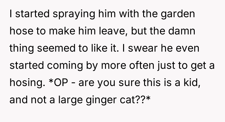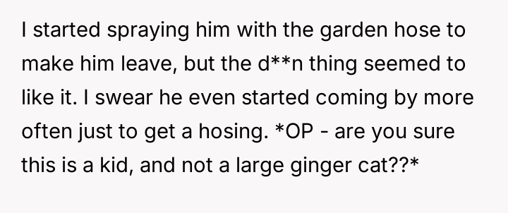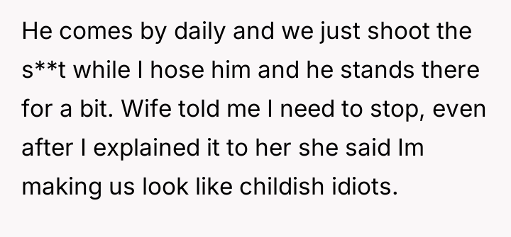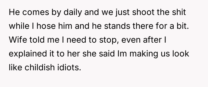 The original poster (OP) has engaged in a recurring, non-standard interaction with a neighborhood child involving the use of a garden hose, which has evolved from an act of territorial defense into a daily, albeit odd, social ritual. The central conflict lies between the OP's enjoyment and perceived harmlessness of this unique routine and his wife's strong disapproval that it makes the family appear childish and foolish.