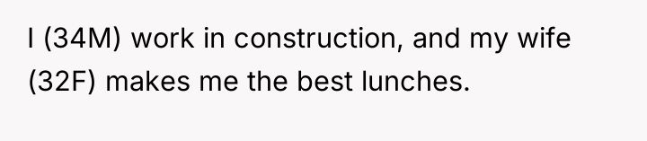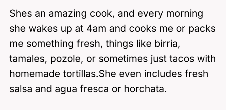 The original poster (OP), a 34-year-old man working in construction, receives elaborate, home-cooked lunches prepared daily by his wife, who wakes up at 4 AM to make meals like birria, tamales, and homemade tacos with fresh accompaniments.