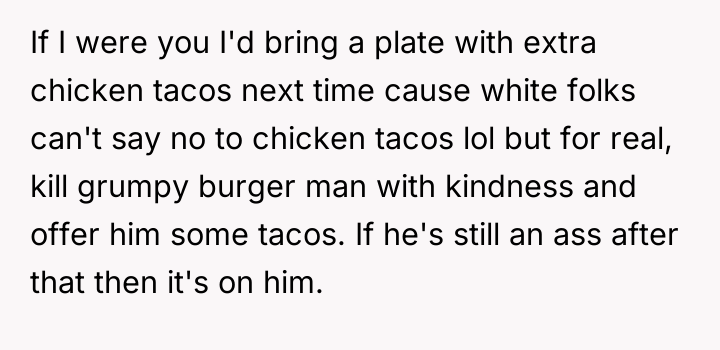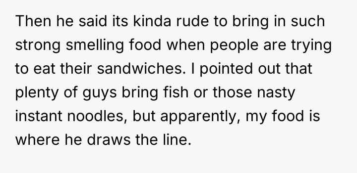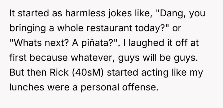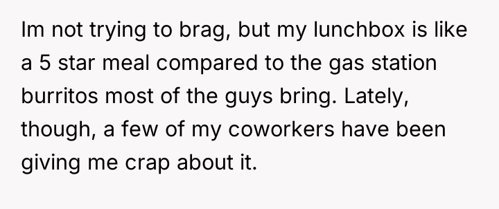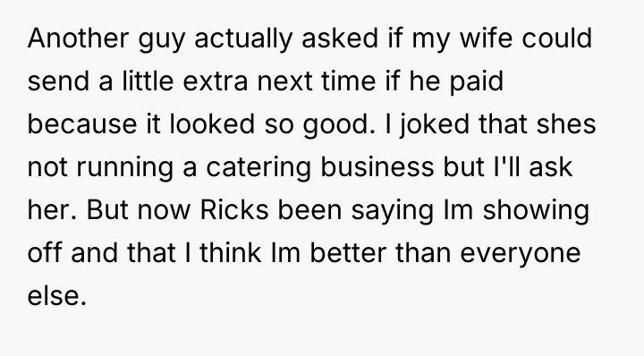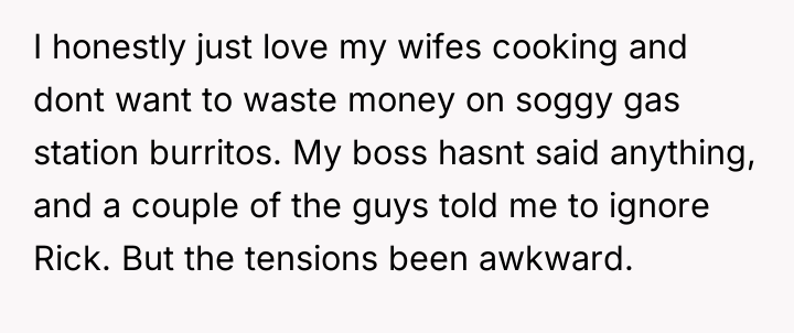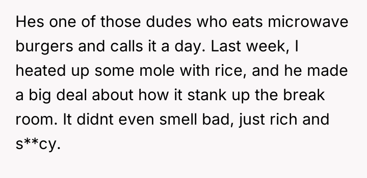 Recently, some coworkers have begun teasing OP about the high quality of his food, escalating when one coworker, Rick, complained that OP's strongly scented mole lunch ruined the break room atmosphere. When OP defended his choice to eat his wife's excellent cooking over standard fare, Rick accused him of showing off, creating workplace tension. OP is now torn between enjoying his wife's wonderful meals and avoiding an awkward environment at work.