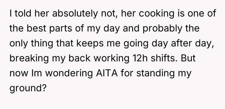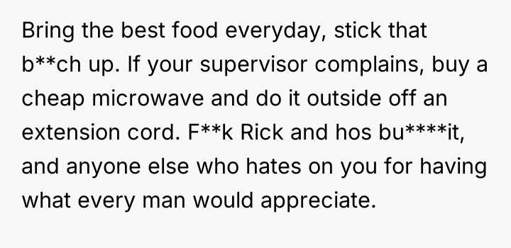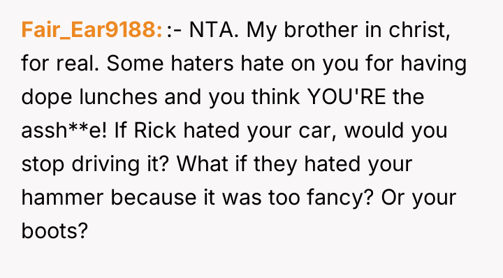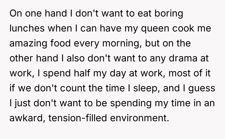 According to Dr. Reese Simmons, a specialist in workplace social dynamics, "Shared spaces require an unspoken contract regarding sensory input; while individuals are entitled to their preferences, respecting the collective comfort level often dictates minor concessions." The core conflict here involves differing standards of 'normal' behavior in a communal setting. OP is rightly proud of the effort his wife puts in, viewing the lunch as a personal benefit and a morale booster during physically demanding shifts. Rick's reaction, however, moves beyond simple teasing into territory of perceived social critique, likely fueled by his own dissatisfaction or jealousy regarding the disparity in lunch quality. While OP's choice is personal, the intensity of the smell in a confined space, like a break room, does cross into the realm of shared environmental control, a common source of low-level workplace friction. The best path forward likely involves a middle ground that affirms OP's commitment to his wife's cooking without ignoring the shared space. Instead of stopping the meals, OP might explore containing the food during heating or eating quickly, perhaps even humorously acknowledging the 'aroma' once, showing he recognizes the complaint without capitulating to Rick's aggressive tone. Defending the wife's effort is crucial, but managing the sensory impact on others is a necessary component of adult professionalism.
