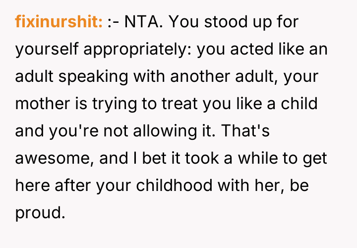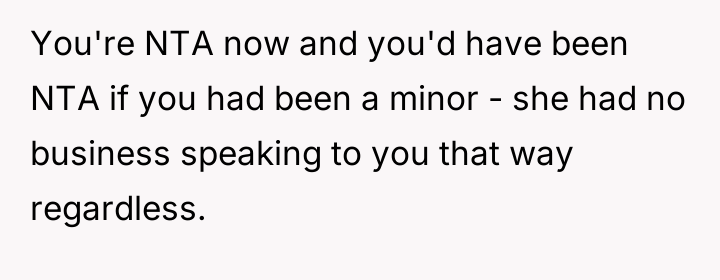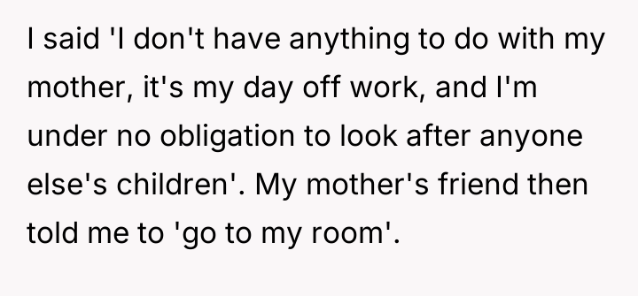 The reaction from the mother's friend—berating the OP and then commanding them to 'go to my room'—was a significant overstep, invoking a parental dynamic that does not exist between them. The OP's response, while heated, was a forceful reclamation of their adult status and established boundaries against both condescension and implied obligation. While direct communication is usually preferable, when an individual is deliberately cornered and spoken down to in their own space (by proxy of the mother's actions), a sharp, definitive statement often serves as the only immediate mechanism to stop the unacceptable behavior.