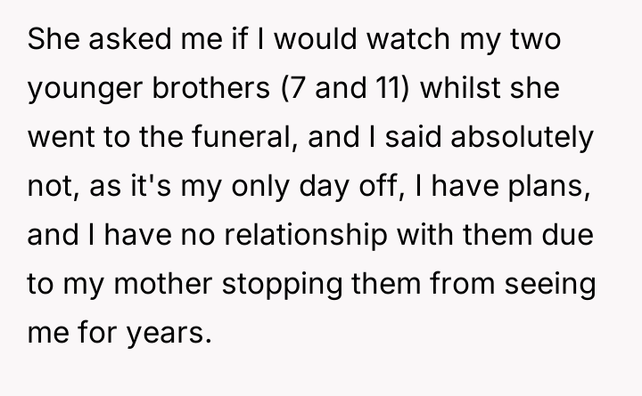 As renowned family therapist Dr. Terri Apter explains, 'We often mistake control for care, expecting those we love to prioritize our needs simply because we love them.' In this scenario, the mother exhibited a pattern of using emotional urgency (the 'emergency' funeral) to manipulate the OP into performing acts of care (babysitting) that go against the established, low-contact relationship. The OP's initial refusal was a clear boundary setting, but the mother's decision to leave the children anyway, even for a perceived '10 minutes,' demonstrated a profound disrespect for the OP's autonomy and stated limits.