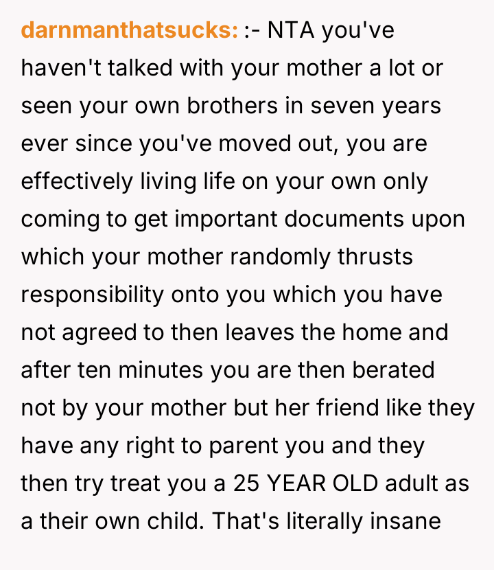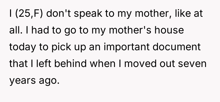 The original poster (OP) sought to complete a necessary, brief task—retrieving an important document from a parent with whom they maintain minimal contact. The central conflict arose when the mother used a sudden 'emergency' as leverage to impose significant, unwanted childcare responsibilities, which the OP rightfully refused. The situation escalated when the mother bypassed the OP's refusal, forcing a brief obligation, which then led to confrontation with the mother's friend.