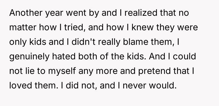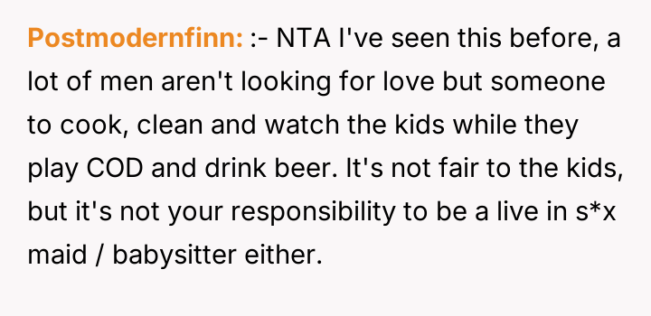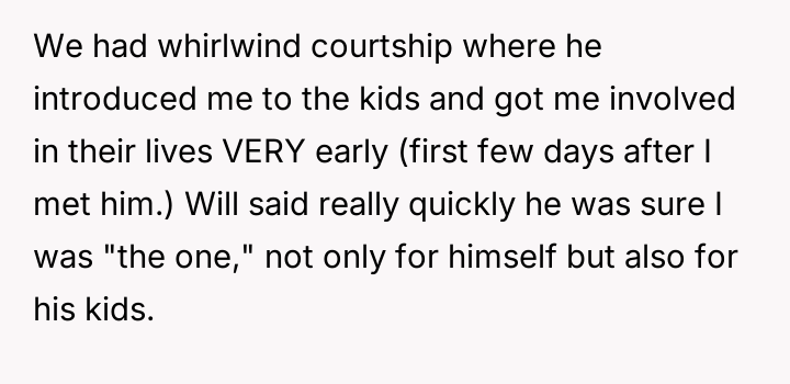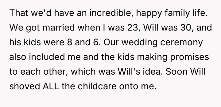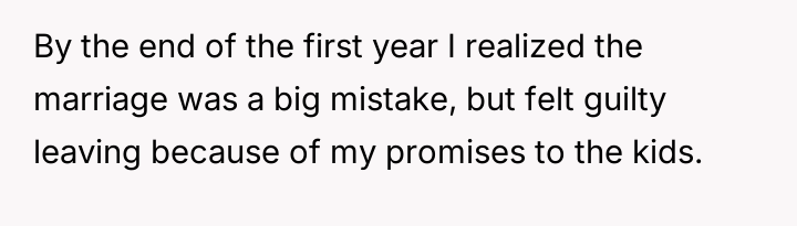 The original poster (OP) entered a rapid marriage with a widowed man, taking on significant childcare and domestic responsibilities while working full-time. When the relationship became toxic, marked by disrespect from the husband and children, the OP chose to leave abruptly due to genuine unhappiness and the inability to form a bond with the children, despite promises made during the wedding ceremony.
