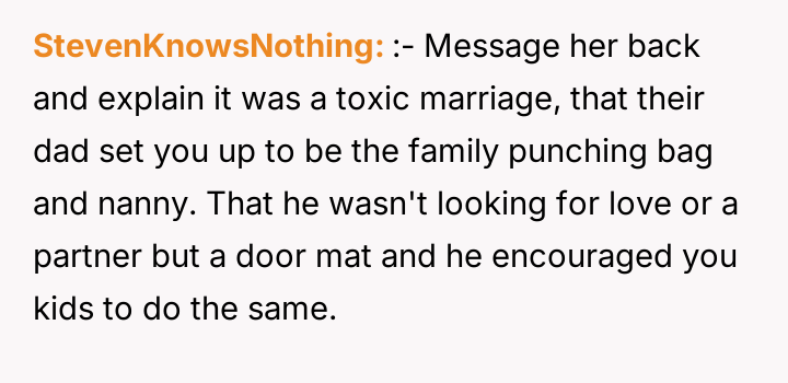 As renowned family therapist and author, Dr. Terry Real, states, 'The opposite of addiction is not sobriety; it’s connection. And the opposite of shame is not perfection; it’s wholeness.' While the OP's situation does not involve addiction, the concept of 'wholeness' is relevant. The OP initially sacrificed her wholeness—her emotional peace and autonomy—by rapidly assuming the role of primary caregiver and partner in a marriage based on unrealistic speed and expectation. The rapid introduction to the children and the inclusion of reciprocal promises at the wedding created an immediate, intense sense of obligation for the OP, which Will then exploited by shifting all domestic and childcare burdens onto her. This dynamic established a power imbalance where the OP was expected to serve while being simultaneously disrespected, leading to burnout and resentment. Her decision to leave, though painful for the stepdaughter, was a necessary act of self-liberation from an emotionally abusive and unsustainable situation. The stepdaughter’s current view frames the OP’s departure as abandonment, ignoring the toxic conditions that preceded it. The OP's action of leaving while no one was home was driven by the exhaustion of attempting to manage the conflict and her genuine realization that she could not feign love for the children. Moving forward, while the OP is not obligated to re-engage, a more effective communication strategy in future difficult situations would be to establish firm boundaries *before* leaving, rather than executing an abrupt exit, though the context here suggests communication had already failed. For the stepdaughter, seeking therapy to process the loss of the entire family structure (father, stepmother, and stability) is recommended.