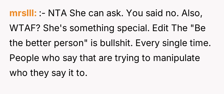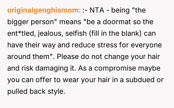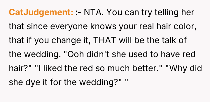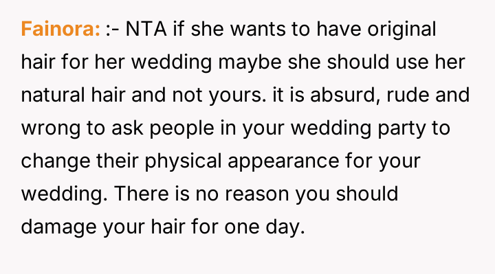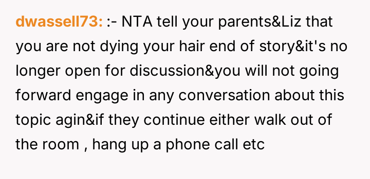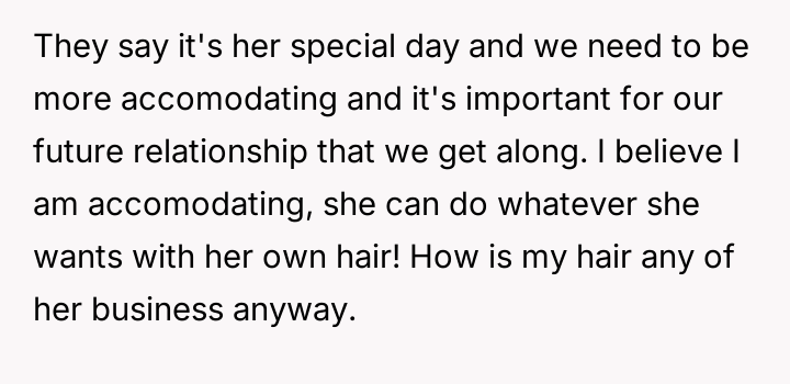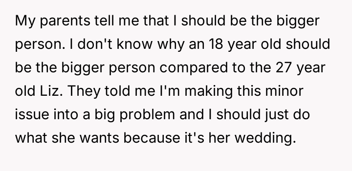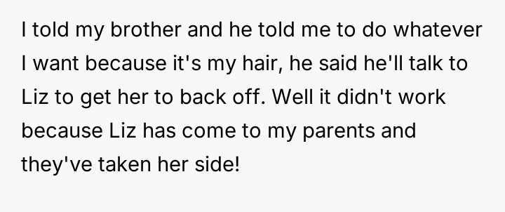 As renowned relationship expert Dr. Terri Apter notes, “Relationships thrive when people feel seen and respected, not when one person constantly subordinates their needs to another's.” This situation centers heavily on the establishment of personal boundaries, particularly in high-stakes family events like weddings. The OP, at 18, is asserting control over their physical self, which is a fundamental aspect of adult autonomy. The future SIL, Liz, is exhibiting controlling behavior often associated with 'bridezilla' dynamics, attempting to manage the appearance of others to fit her vision of perfection. The parents' intervention compounds the issue by shifting the focus from Liz's unreasonable request to the OP's supposed obligation to 'be the bigger person.' This framing unfairly places the burden of emotional labor and compliance on the younger sibling rather than addressing the inappropriate demands made by the bride. The OP's refusal to change their hair is appropriate, as bodily autonomy outweighs aesthetic preferences for a wedding, even if the OP pays for the change. A constructive recommendation would be for the OP to communicate clearly, perhaps with the brother, reinforcing that while they support the wedding, their physical appearance is non-negotiable. If the parents continue to pressure them, setting a firm boundary regarding future discussions about this topic would be necessary to protect their autonomy moving forward.