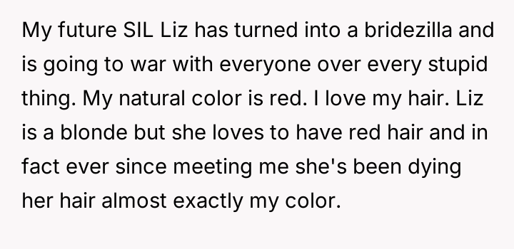 The original poster (OP) is facing intense pressure from their future sister-in-law (SIL) and their own parents to change their natural hair color solely to ensure the SIL has a unique appearance on her wedding day. The central conflict lies in the OP's assertion of personal autonomy over their body versus the family's collective prioritization of the bride's comfort and the perceived need to maintain peace by complying with her demands.