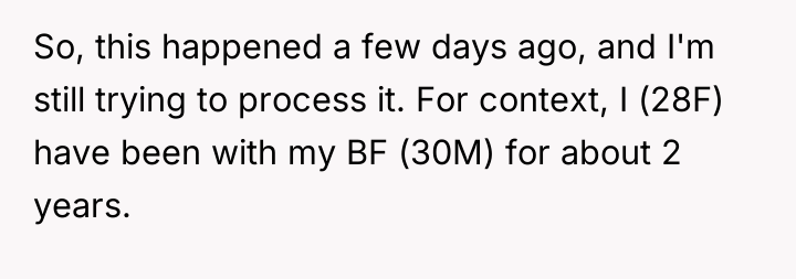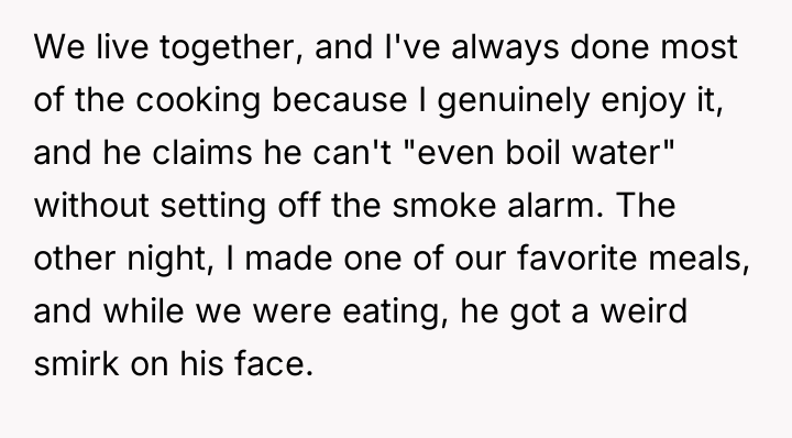 The story involves a 28-year-old woman (OP) and her 30-year-old boyfriend of two years, with whom she lives. The OP has traditionally handled most of the cooking because she enjoys it. The conflict began after a shared dinner when the boyfriend revealed he had prepared a detailed presentation critiquing her culinary efforts.