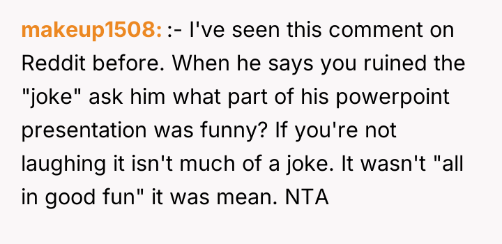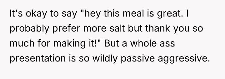Professionally, the boyfriend's behavior suggests an immature approach to conflict and feedback. A constructive path forward would involve the OP clearly articulating *why* the PowerPoint was unacceptable—focusing on the disrespect, not the seasoning. If the relationship is to continue healthily, the boyfriend must apologize sincerely for the method used, acknowledge the hurt caused, and commit to discussing domestic contributions or offering constructive feedback in a private, respectful manner, perhaps starting by making his own meals.