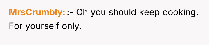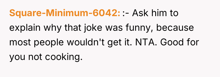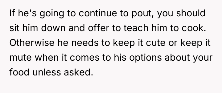 The OP's immediate reaction—stopping cooking entirely—is a clear boundary enforcement mechanism. It is a direct, albeit reactive, response to feeling devalued. The boyfriend's subsequent sulking and accusation that she is 'ruining the joke' reveals a lack of accountability and an inability to accept responsibility for the emotional impact of his actions. He is prioritizing his perceived right to joke over his partner's demonstrated distress.
