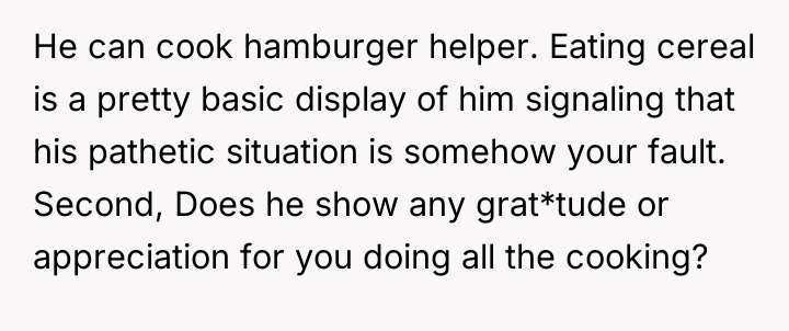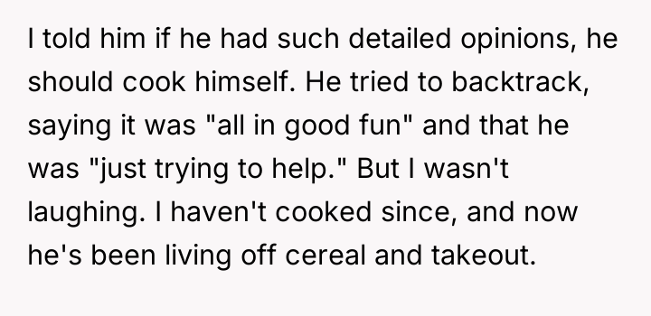This presentation, t*tled "Improving Our Home Dining Experience," included specific critiques on her dishes and even an image of Gordon Ramsay with a caption suggesting his disapproval. When the OP reacted negatively and suggested he cook if he had such strong opinions, the boyfriend dismissed her feelings, claiming it was just a joke. The OP is now refusing to cook, leaving him to rely on cereal and takeout, and she is left wondering if her reaction was an overreaction.